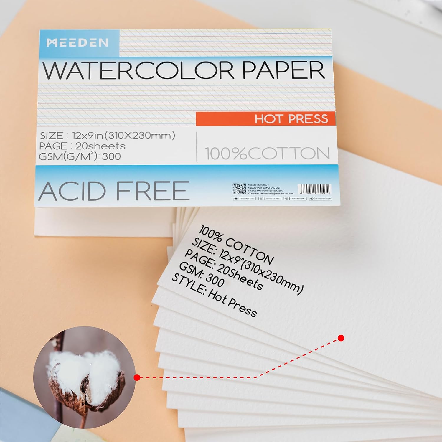 - ACID-FREE & RECYCLABLE: MEEDEN Watercolor Paper, each sheet measures 9x12",140 lb/300 grams. Acid-Free (pH Neutral) signifies the non-yellow features and fading resistance. With a total of 20 sheets of hot-pressed watercolor paper, drawing, lining, and painting, it is excellent to go with creating fantastic artwork and sketches.