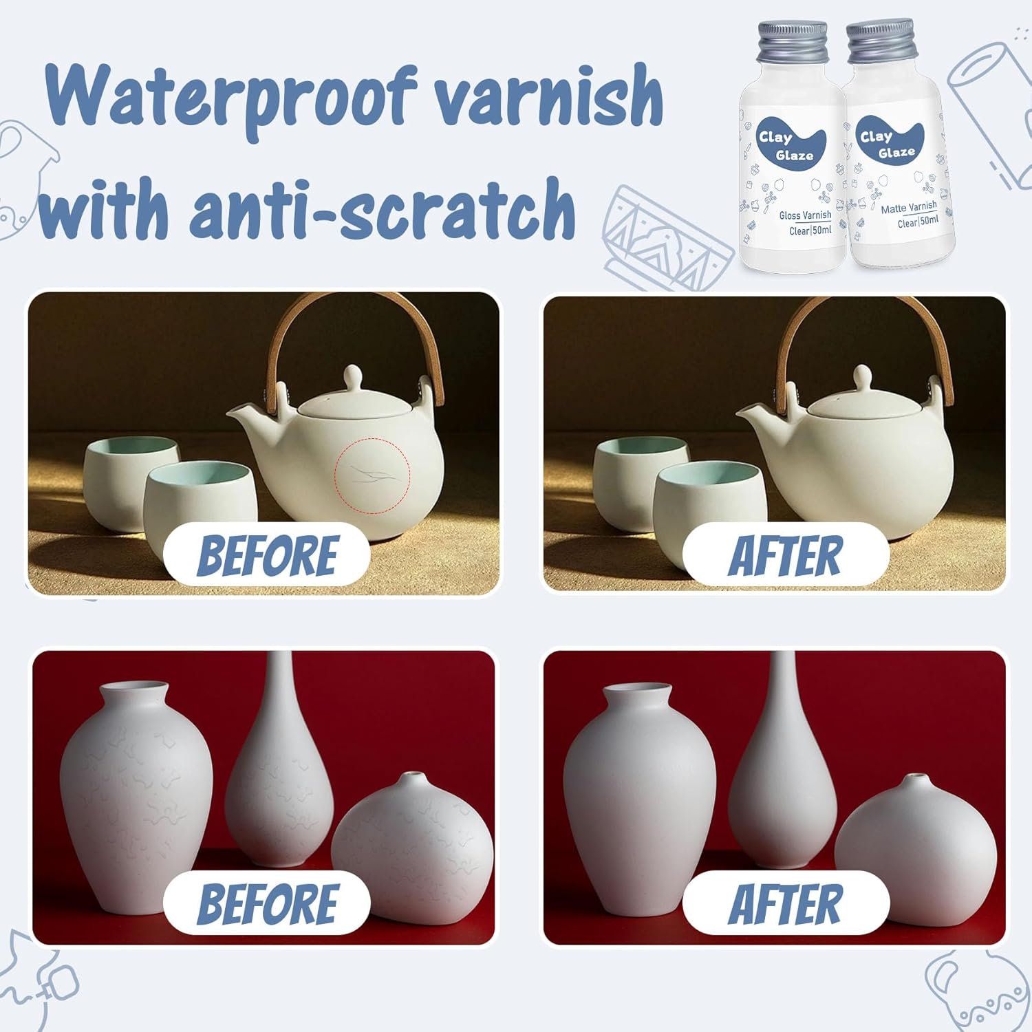- Designed for Air Dry Clay: Still worried about your airdry clay creations being poorly watertight and easily scratched? Try our specially designed clay varnish for air-drying clay. The air-dry clay polymer clay glue will help your crafts to be waterproof and scratch-resistant, adding a gloss look that you will love