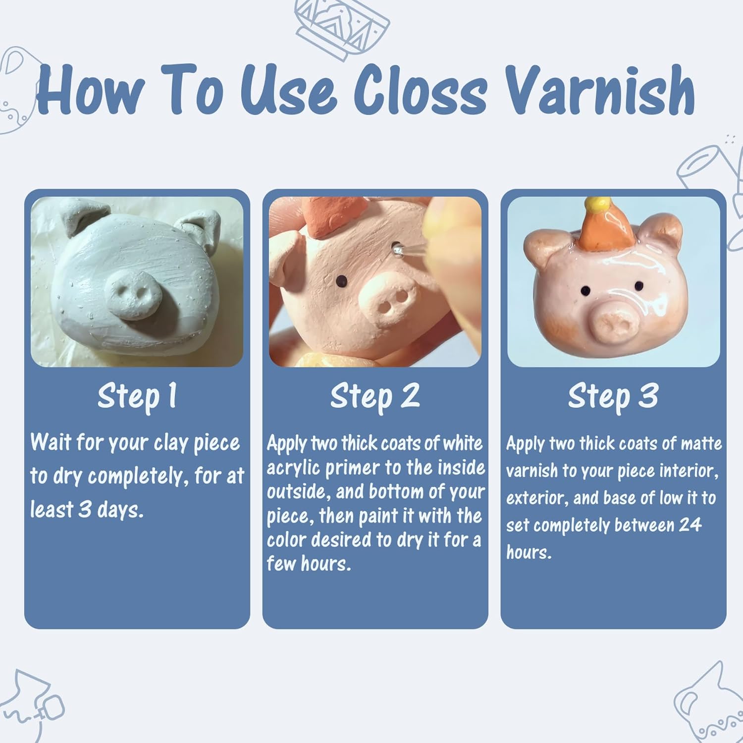- How To Use: 1, Wait for your clay piece to dry completely, for at least 3 days; 2, Apply two thick coats of white acrylic primer to the inside, outside, and bottom of your piece, then paint it with the color desired to dry it for a few hours; 3, Apply two thick coats of gloss varnish to your piece interior, exterior, Allow to dry for at least 24 hours