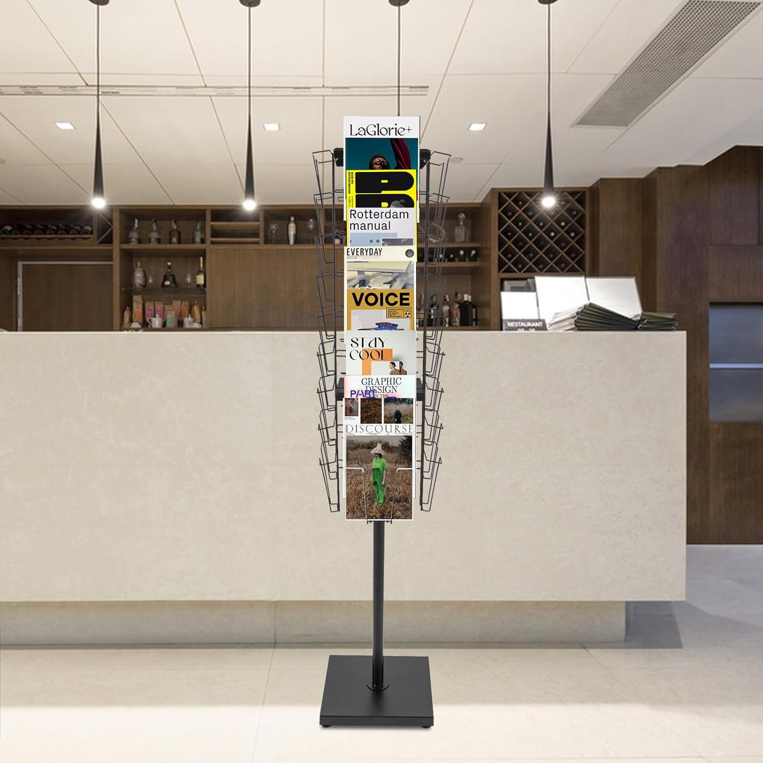 - 【Design】360°Rotating. 63 inch tall and narrow 9-layer 36 pockets design, large capacity without taking up space, easy to carry and move. Metal wire pocket fence to effectively prevent books and magazines from falling off. Metal mesh designed to provide ventilation and keep books or magazine booklets dry. Open design allows easy access to magazines brochure pamphlet flyer and comics books even when placed in corners.