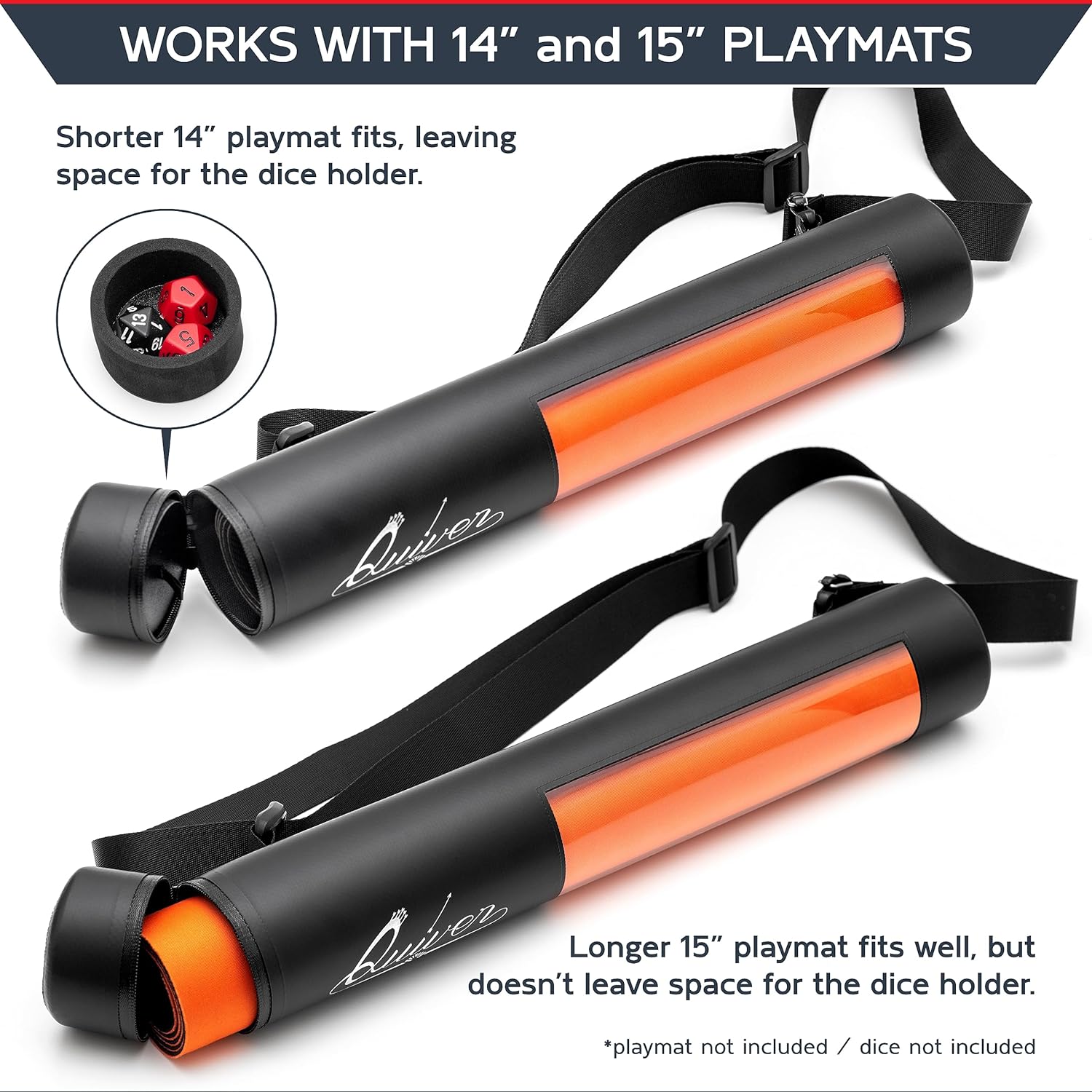 Quiver Time Black XL Orion Playmat Tube - TCG MtG Playmat Tube Case with Waterproof Zipper, Hidden Dice Pocket, Adjustable Removable Shoulder Strap, See-Through Window, Fits 14" and 15" playmats