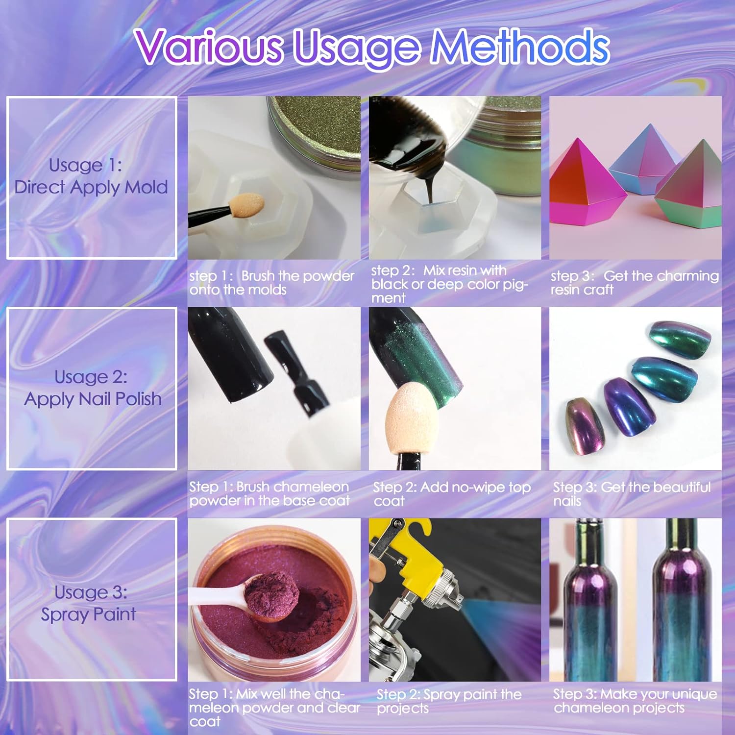 - 🫧Mica pigment's 3 Different Effects: Different color bases create a different effect surface. Applying pearl powder on a white background will produce aurora effect, and on a black background will be chrome effect. Mixing a small amount of pearl chrome nail powder into the black resin will produce like starry sky effect. So easy to use to get the variety of colors you’re looking for!