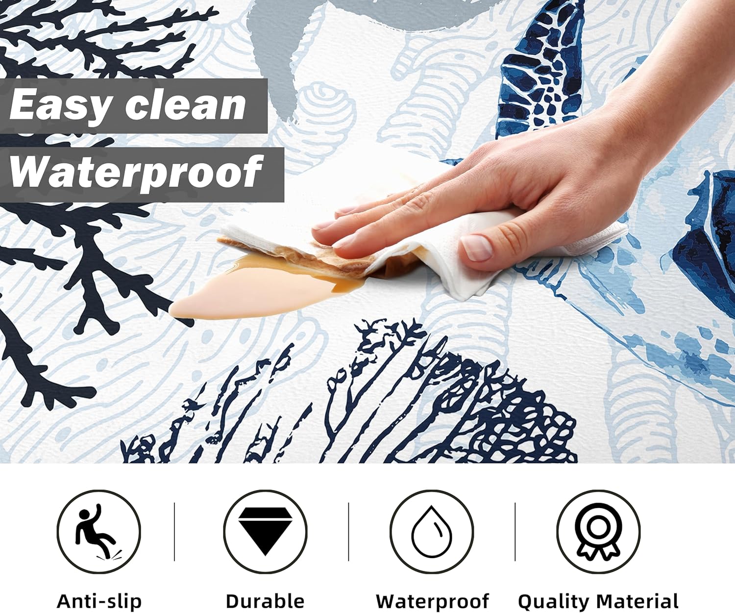- Stylish Design: Bright Navy Blue Coral Sea Turtle pattern kitchen rug set of 17.3" x 28" + 17.3" x 47" Thickness 0.4 inches (1cm). This rug mat set is not only suitable for an indoor kitchen sink, living room, bathroom makeup counter, hallway, or entryway but also for an outdoor patio, garden, terrace, garage, etc anywhere you want to place it.