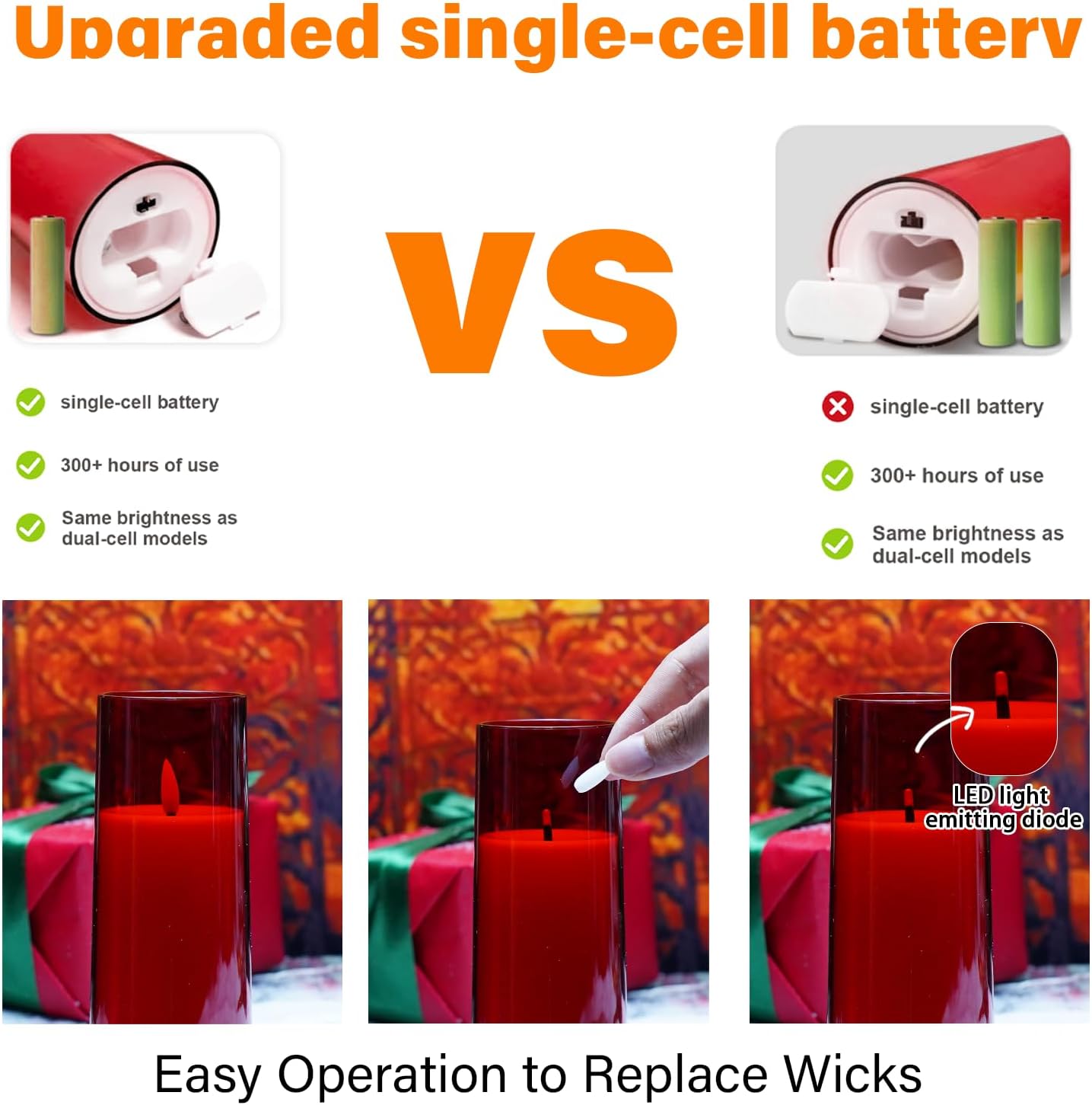 - UPGRADED VERSION - SINGLE BATTERY:Introducing our flameless candles with an advanced battery technology that lasts over 300 hours on just one single battery! That's right, unlike other brands that require two batteries, our candles are powered by only one battery without compromising on brightness. Not only is this energy-saving feature practical and convenient, but it also makes our candles a cost-effective choice.Per battery candle is powered by 1 x AA batteries (Not included).
