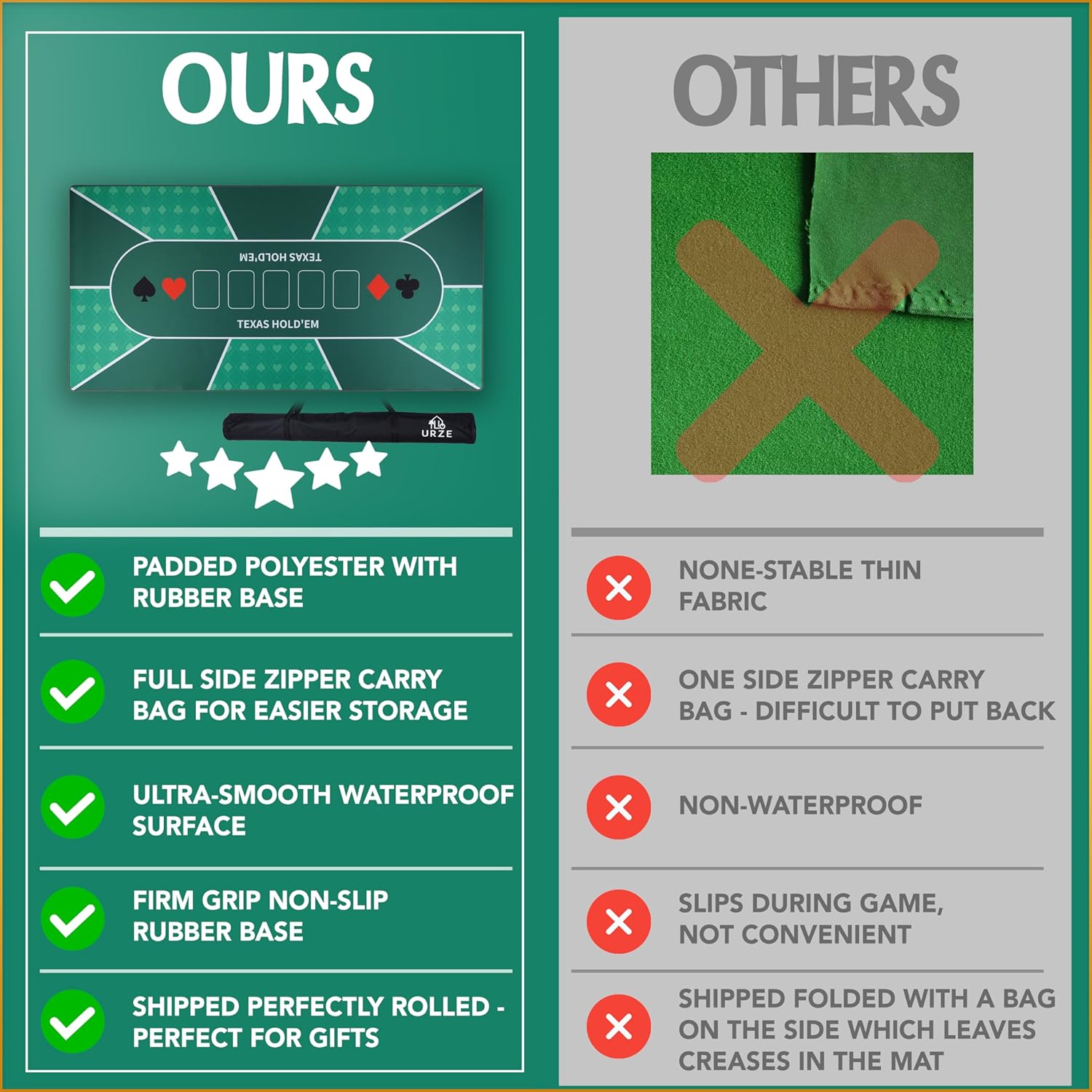 - UNZIP, ROLL & PLAY - Our poker table mat allows for a quick and hassle-free setup. When the game is over, it can be conveniently rolled up and stored in the included carrying case, saving you space and time.