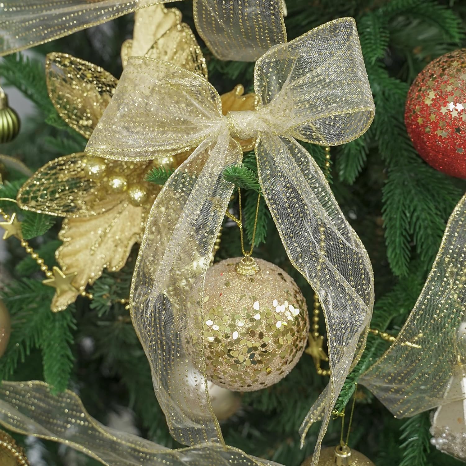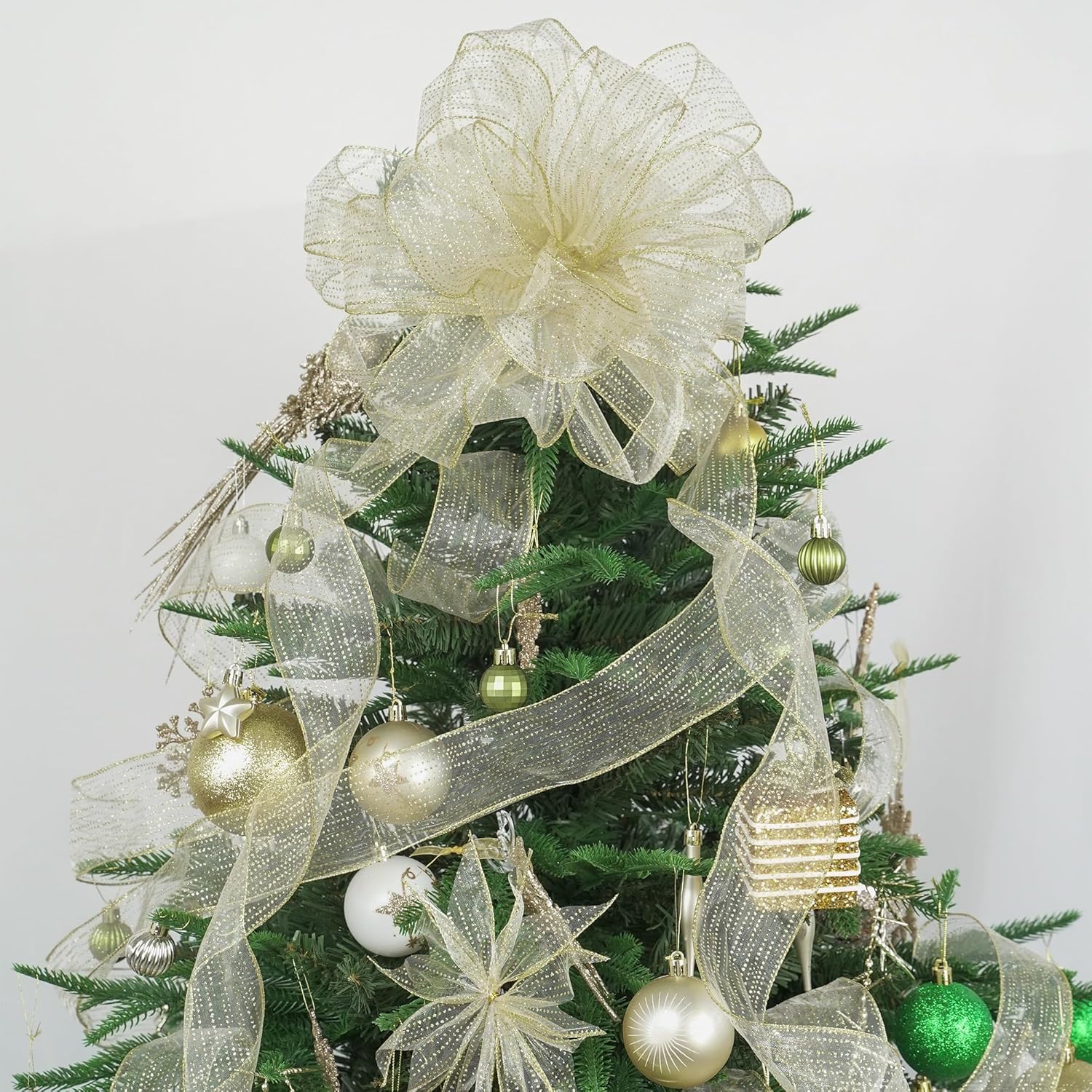 - Sheer wired ribbon base with sparkly glittery dots is available for a variety of occasions. The premium-quality material is great for Halloween decoration, Christmas decoration, fall decoration, wedding parties and birthday parties. This fabric ribbon is perfect for decorating a tree topper, accentuating a theme wreath, wrapping holiday gifts, adorning wedding favors, enhancing birthday presents, stunning on your mailbox, swags, gift baskets, staircase, or centerpieces...