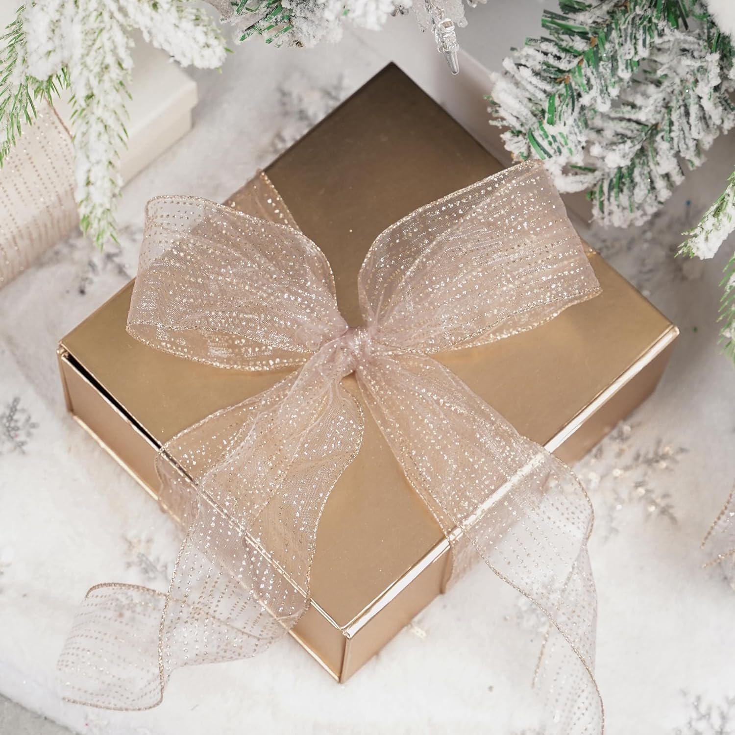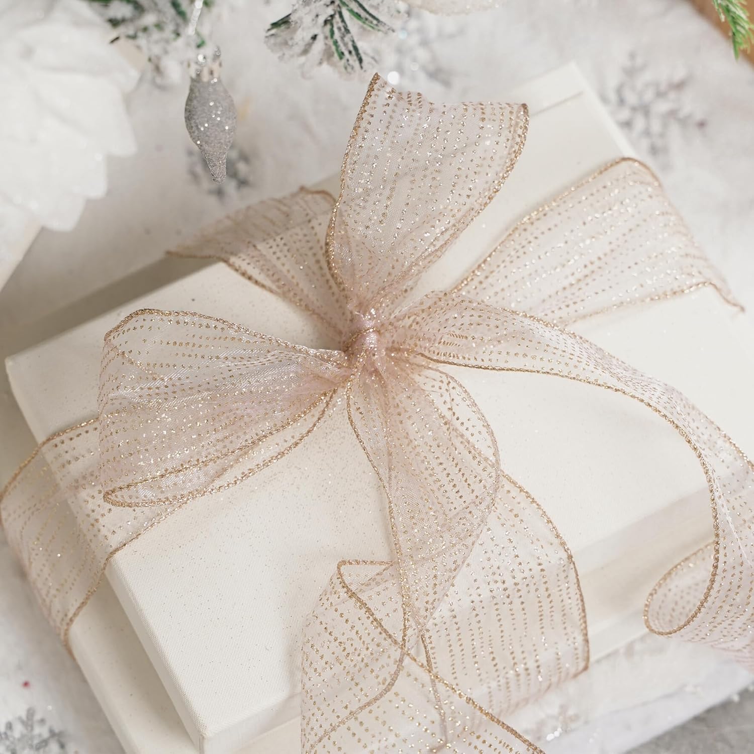 - Our beautiful glitter spangle striped ribbon is made from fine, rose gold sheer organza ribbon that is adorned with sparkly champagne gold glitter dots in horizontal stripes. It features metallic threaded wired edges on both sides of the ribbon. The bright gold glitter ribbon is 2-1/2 inches wide and 25 yards (approx. 75 feet) in length. This is a sheer glittered fabric ribbon and would look great in your theme wreaths and Christmas bows. Perfect for your upcoming holiday decorations!