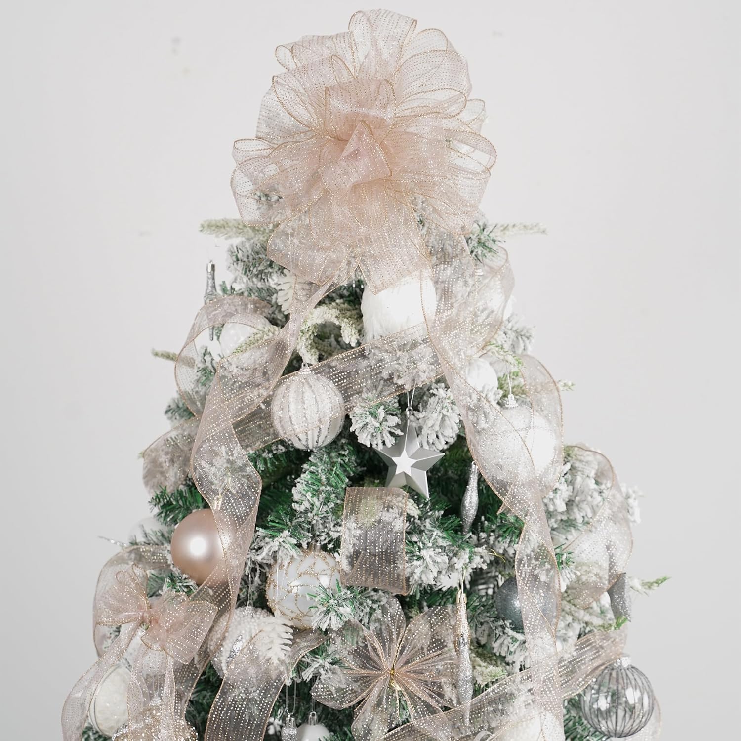 MEEDEE Rose Gold Sheer Glitter Wired Ribbon 2.5 Inch Horizontal Stripes Polka Dot Christmas Ribbon Organza Sheer Glitter 25 Yards for Christmas Tree, Wreath, Bow Making