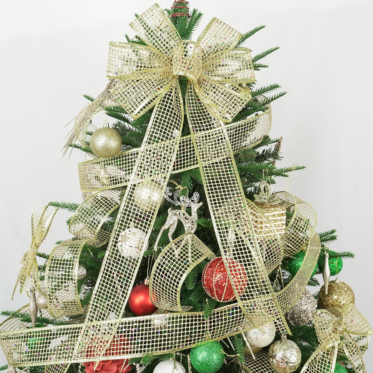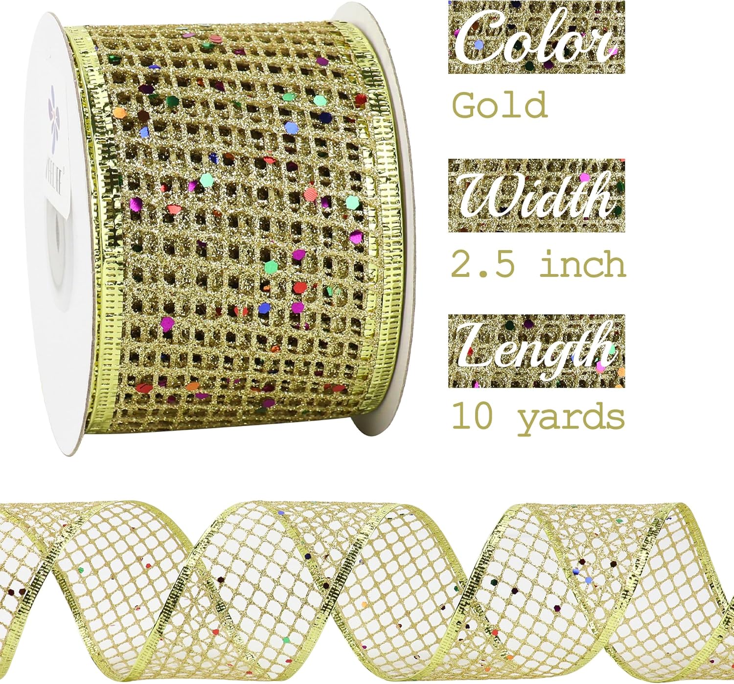 MEEDEE Gold Glitter Ribbon Gold Christmas Ribbon 2.5 Inch Square Mesh Net Wired Ribbon with Rainbow Sparkle Gold Wired Ribbon Gold Ribbon for Christmas Tree Decoration, Wreath Bow Making (10 Yards)