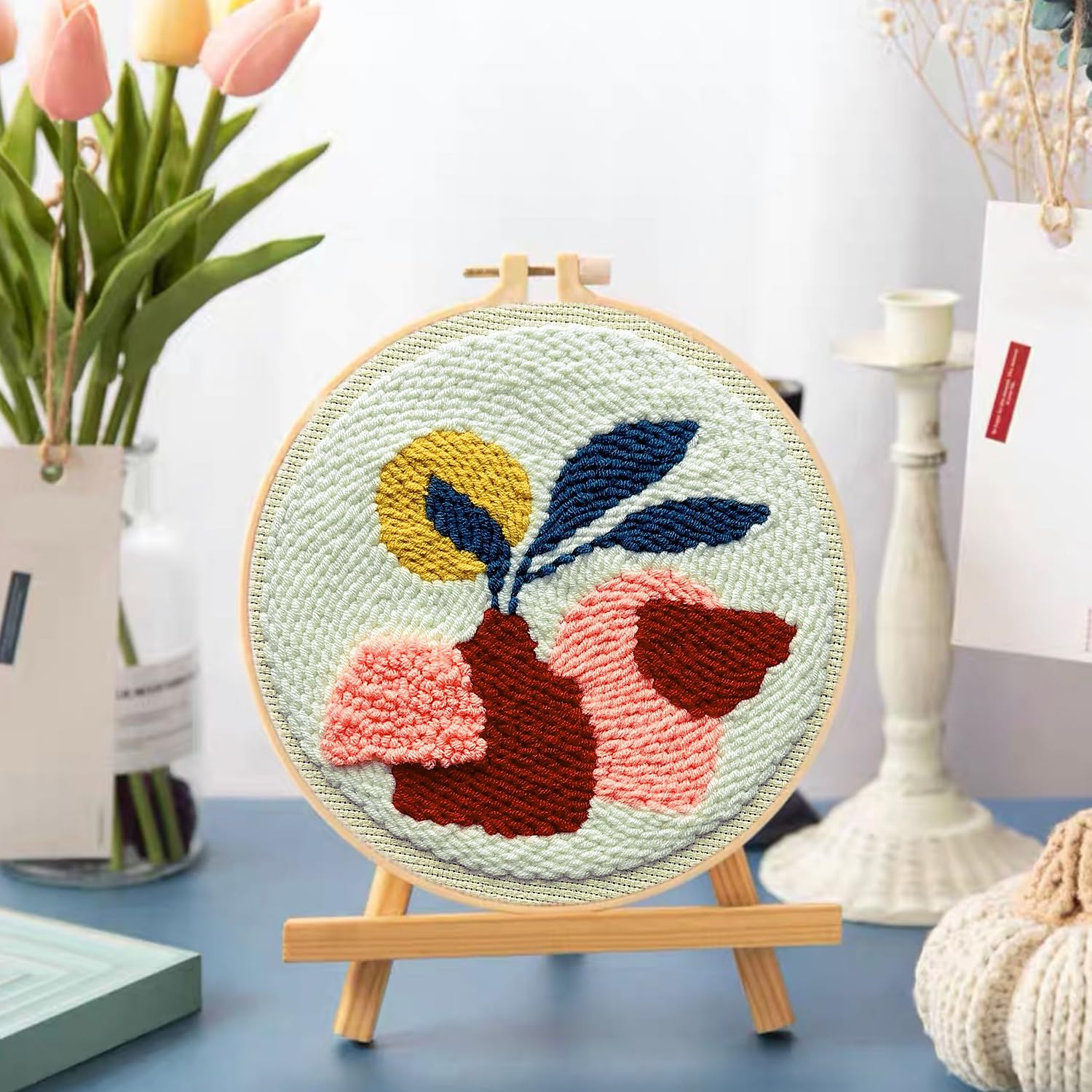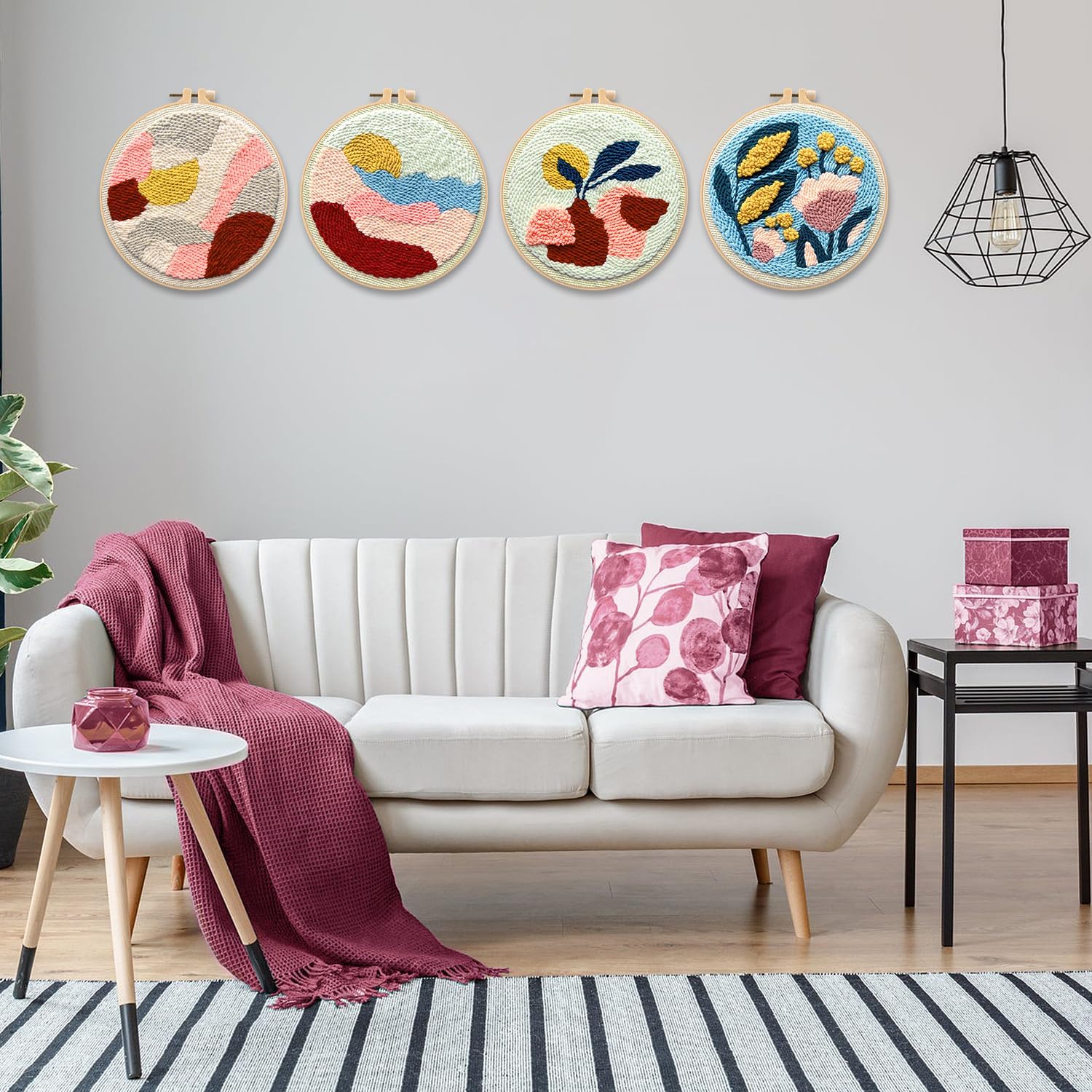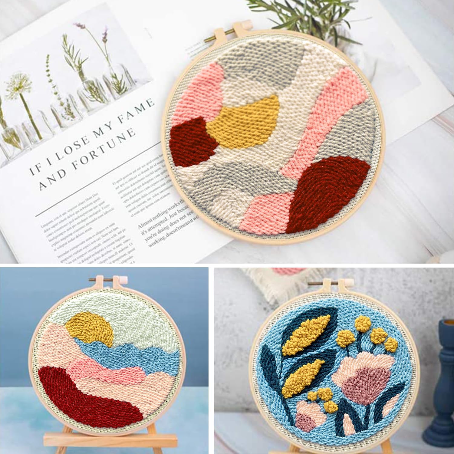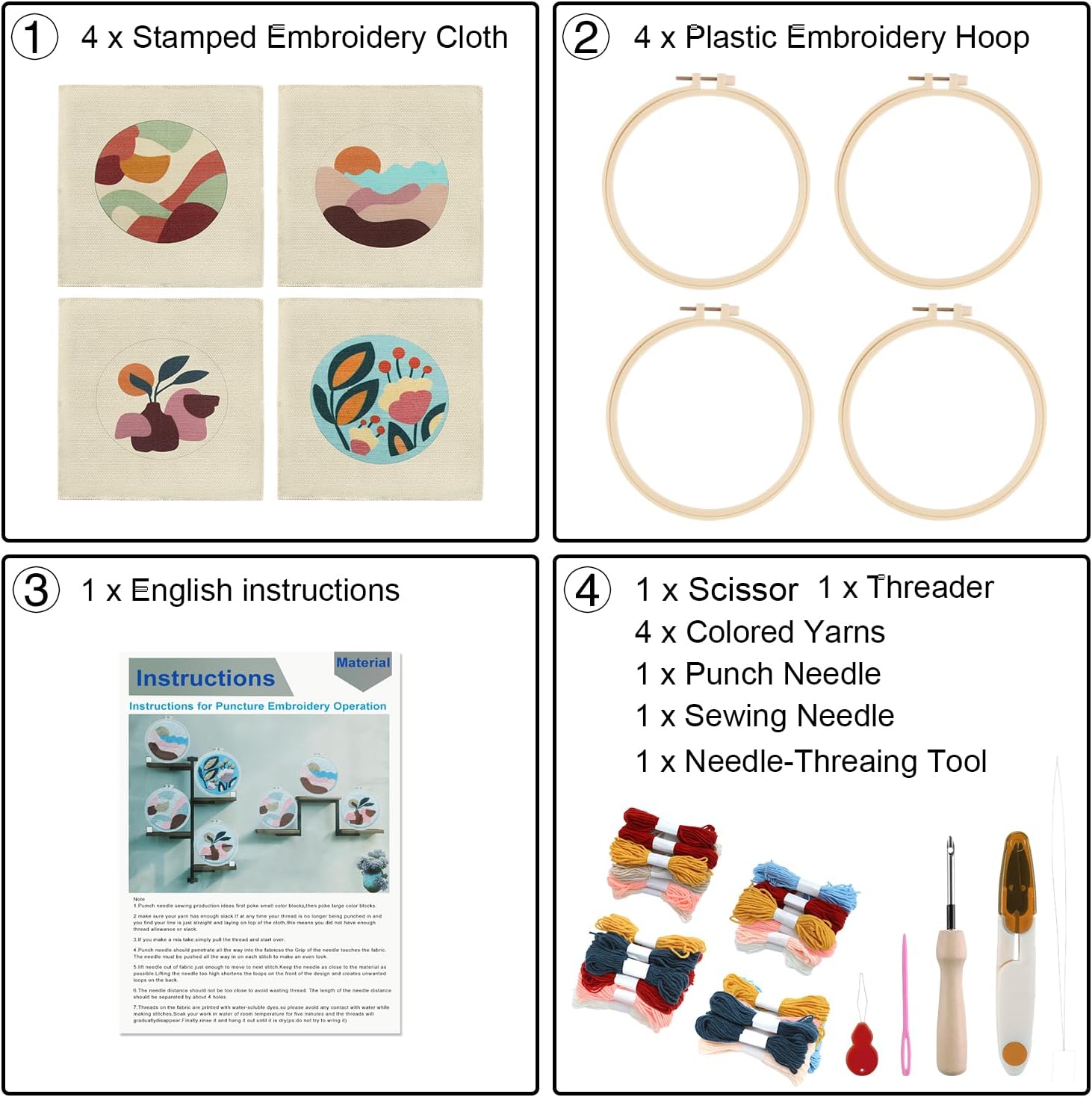 - [Complete Punch Needle Kit] - This comprehensive Punch Needle Kit includes everything you need to create beautiful crafts: 4 x adjustable hoops (7.8 inch), 4 x punch needle fabric pieces, 4 x instructions, 1 punch needle, 1 x scissor, 1 x needle-threading tool, and enough high-quality yarn.