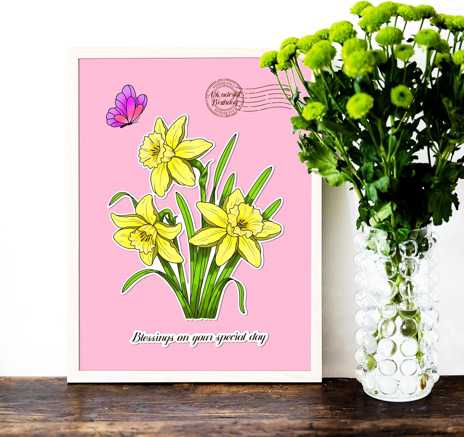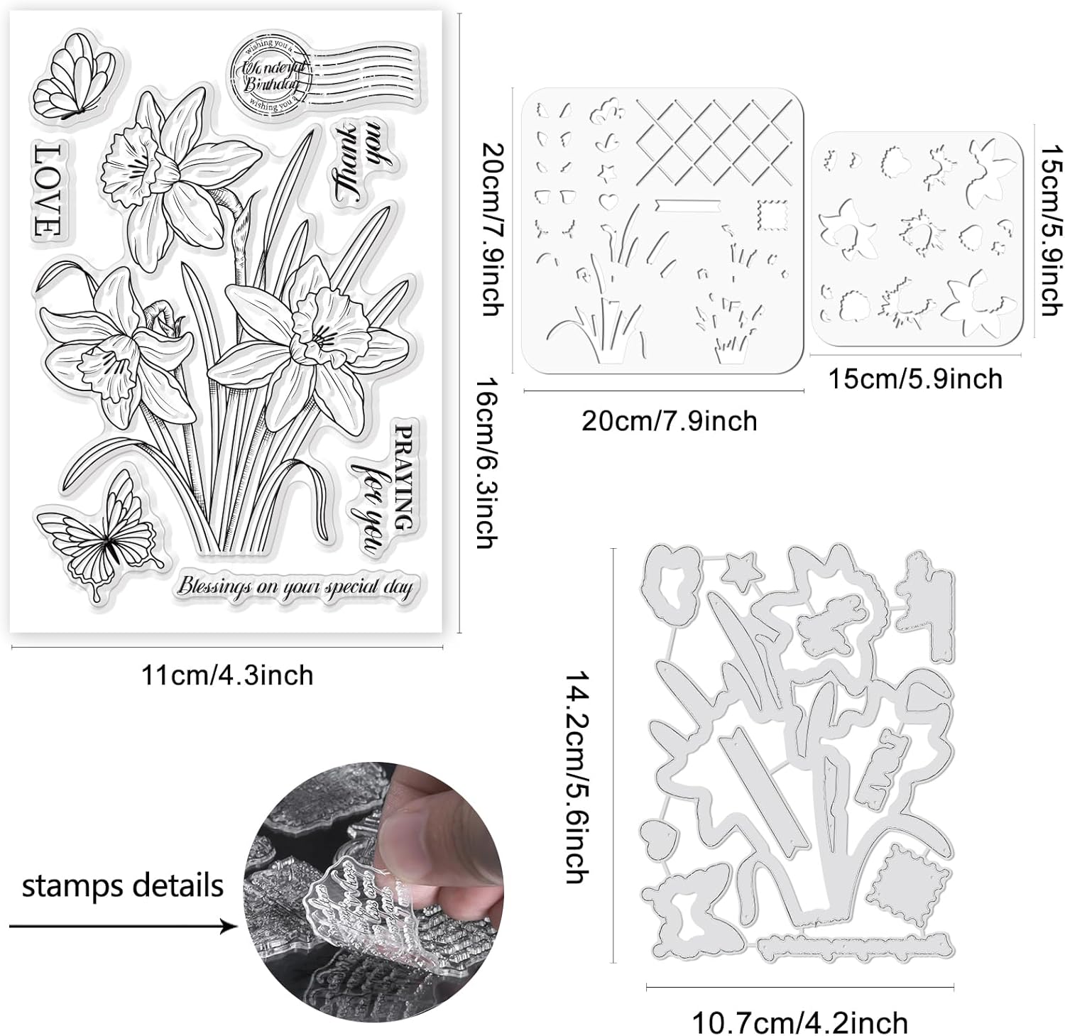 - Package Includes: You will receive 1 sheet clear stamps with a bouquet of daffodil flower and butterfly and sentiments, 1 set matching cut dies for cutting daffodil flower and other shapes, and 2 pieces PET stencil can be used to create color layering effects.