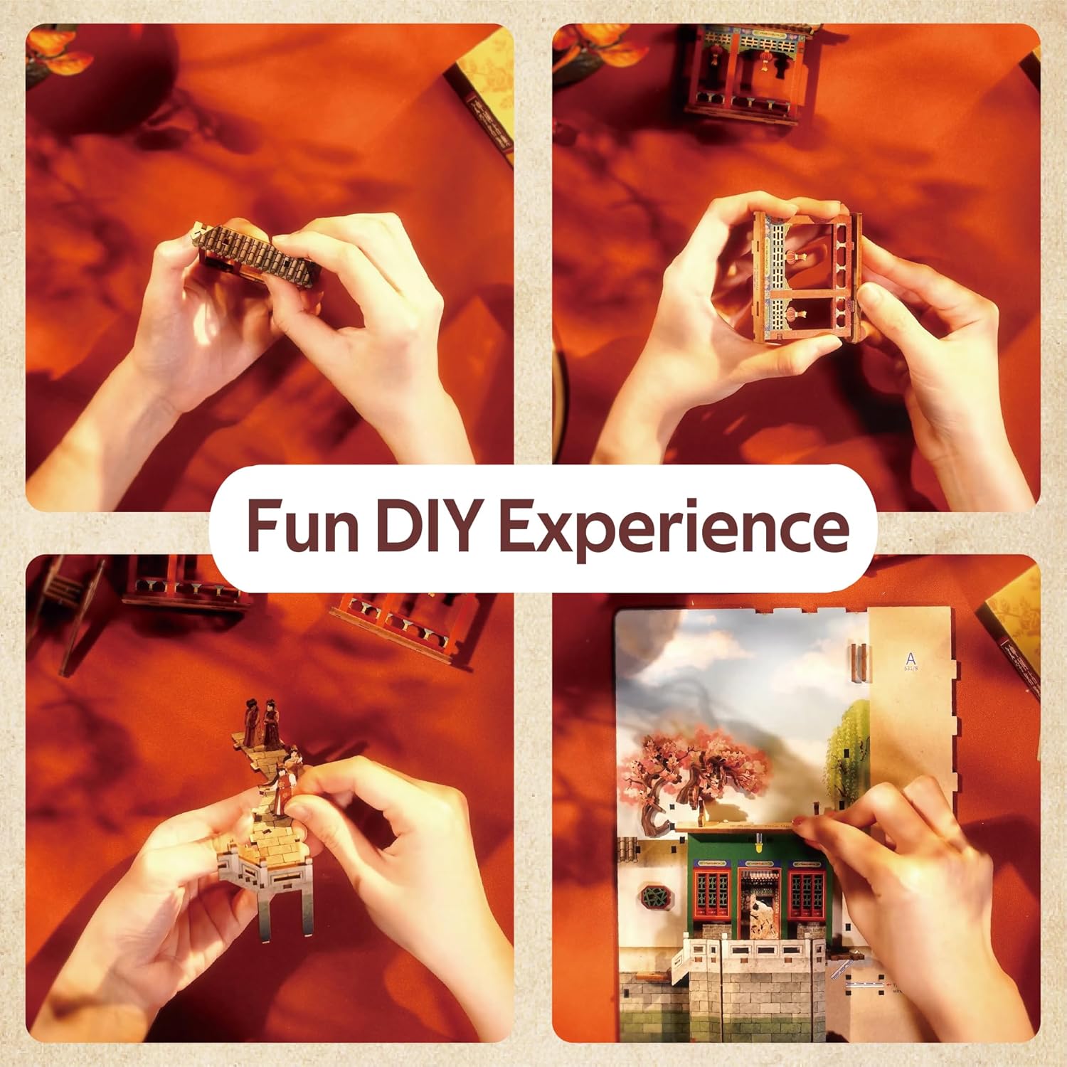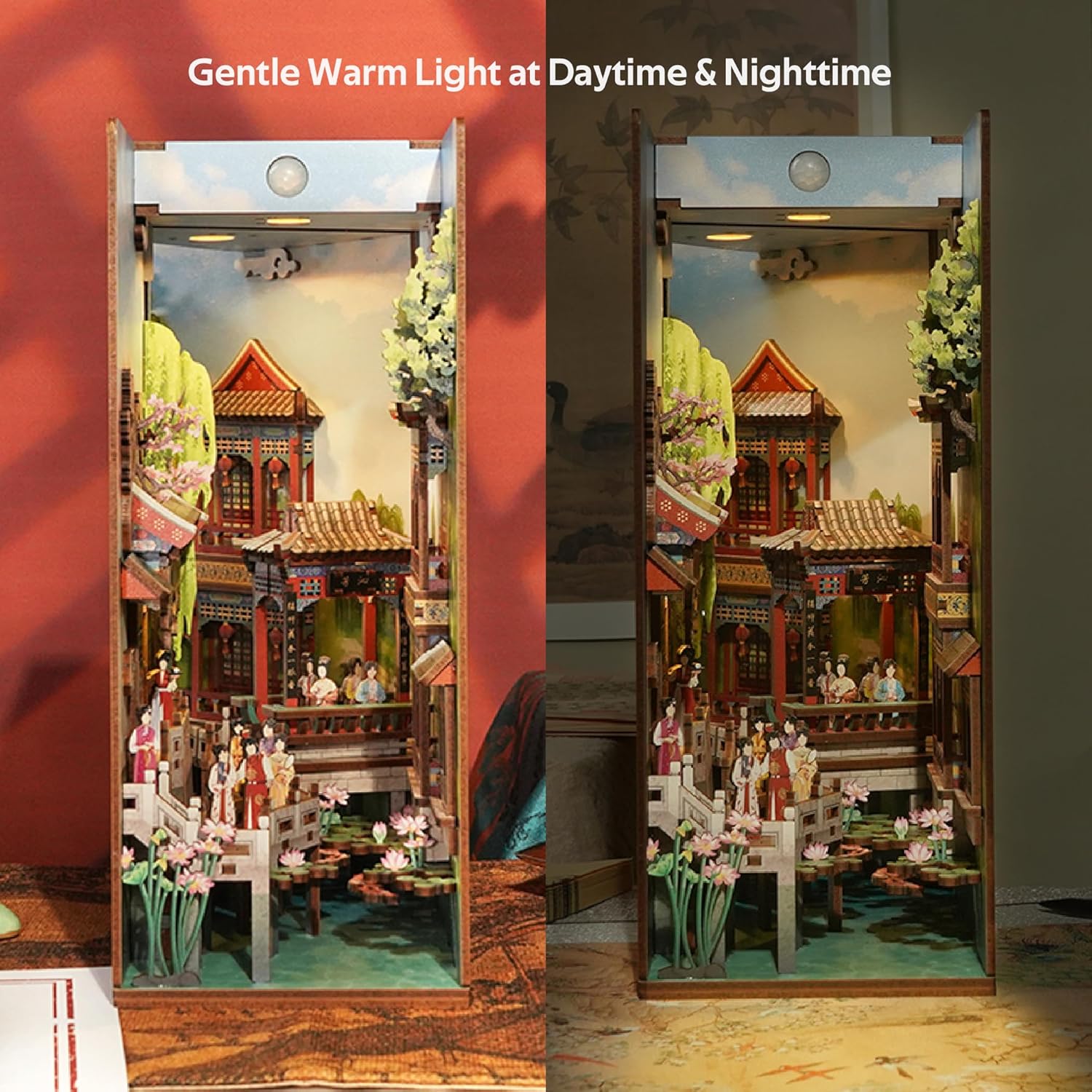 - Dream of Red Mansions: Tonecheer DIY Chinese style book nook kit with dust cover is inspired by the renowned Chinese literary masterpiece “Dream of Red Mansions”. The 3D Chinese puzzle vividly showcases the romantic scene of characters from the book walking through pavilions and watching blooming lotus flowers together.