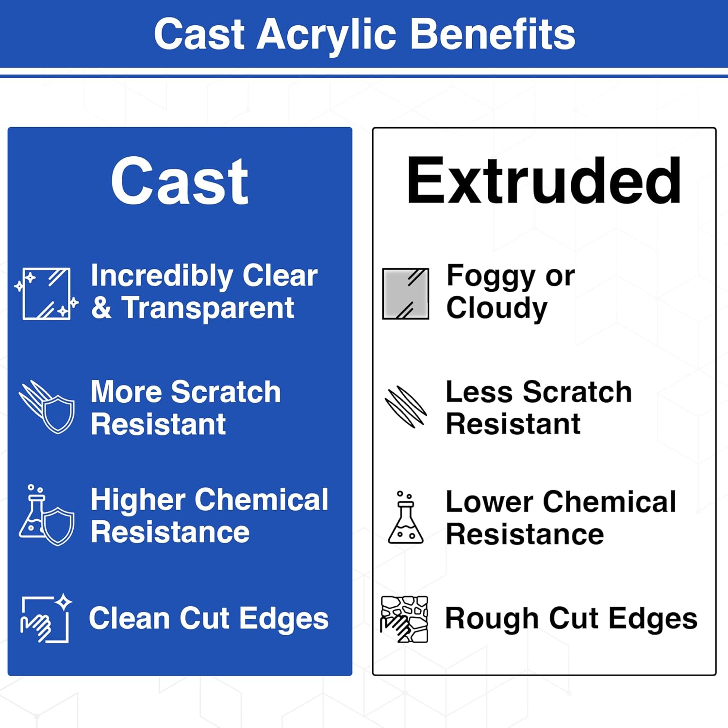 - EASY TO CUT OR DRILL - These 1/8 inch acrylic panels are easier to work with than glass and strong enough for load-bearing designs. In addition, they can be cleanly cut or drilled using a table saw, router, CNC, or laser without chipping or cracking