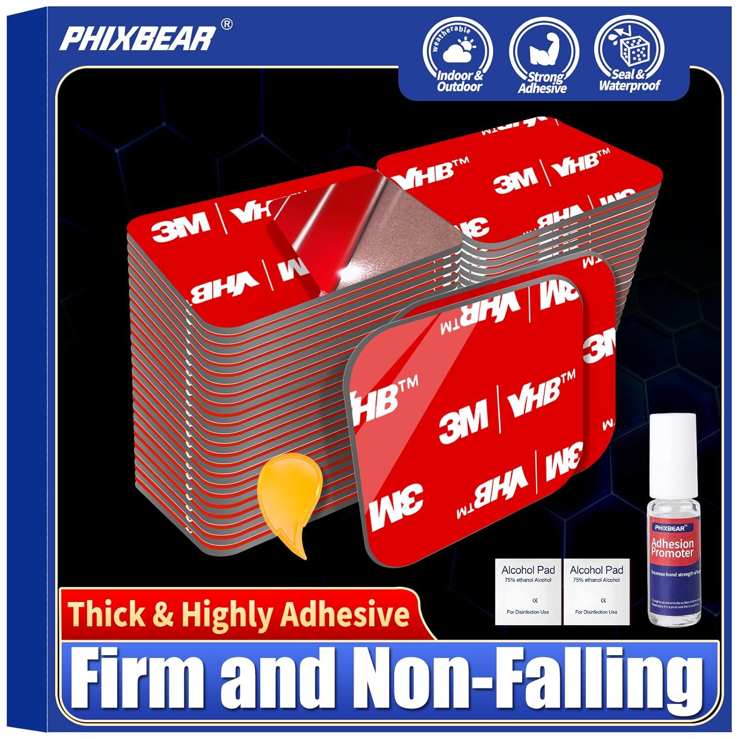 - ABUNDANT QUANTITY:Contains 48 pieces Made of 3M VHB Strong adhesive double-sided tape, square 1.18x1.38 Inch, to meet your wider use. And a bottle of adhesion promoter and two alcohol pads .