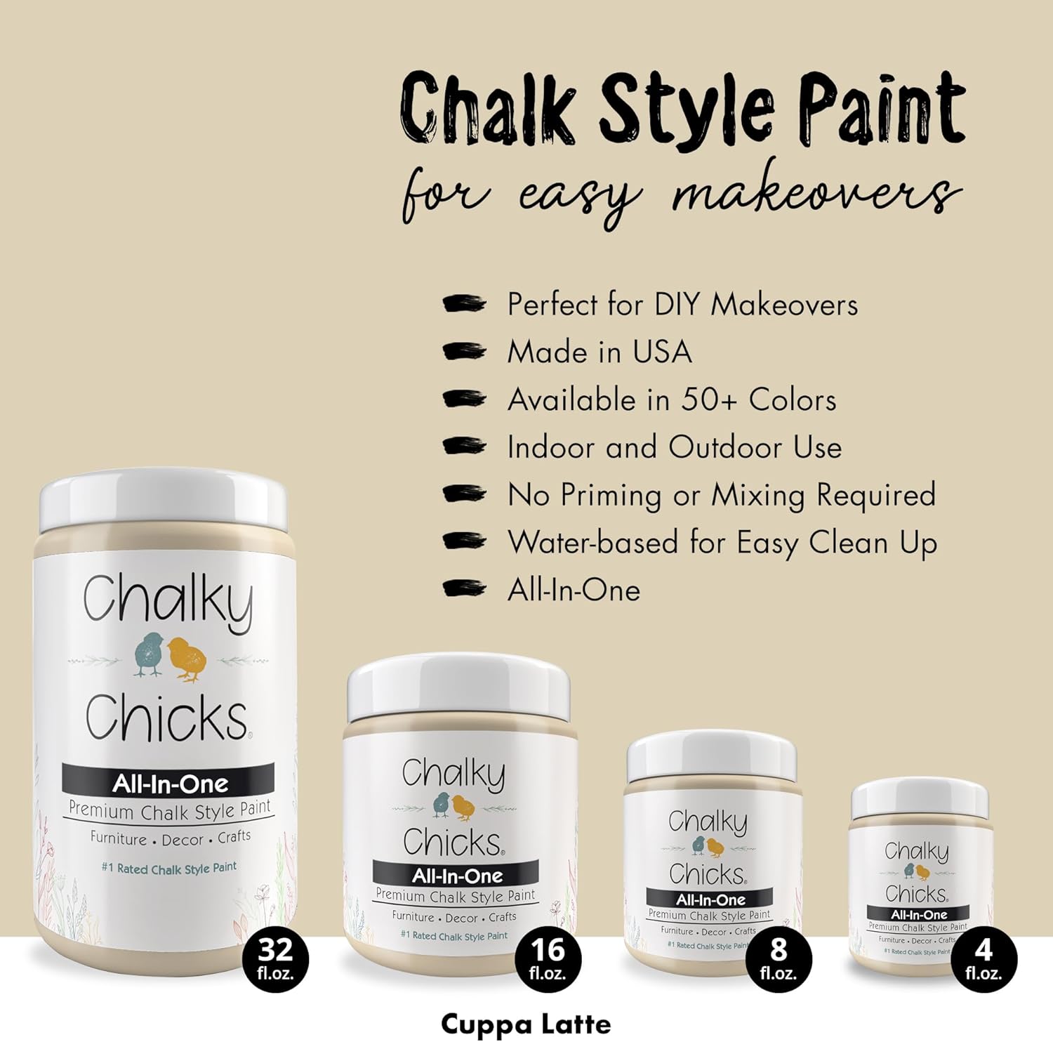 Chalky Chicks All-in-One Chalk Paint for Furniture or Cabinet - 4 Fl Oz - Matte Finish Cuppa Latte Tan for Metal, Wood Furniture Paint - No Sanding All-in-One for Home Decor & Crafts, USA Made