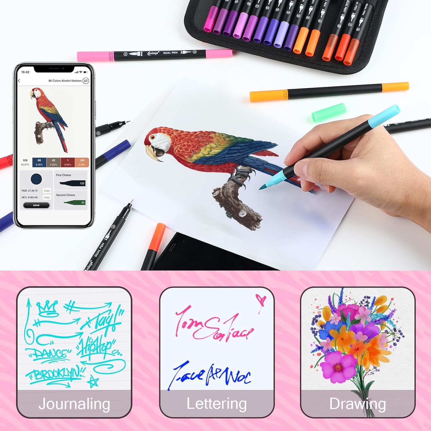 - APP Feature : The APP features include intelligent algorithm-based recommendations for the most suitable color codes for dual markers brush pens for drawing. It provides rich doodle materials and color schemes to enhance your drawing experience. The App also offers professional HUE color matching functionality and an electronic color card feature for easy access to color references