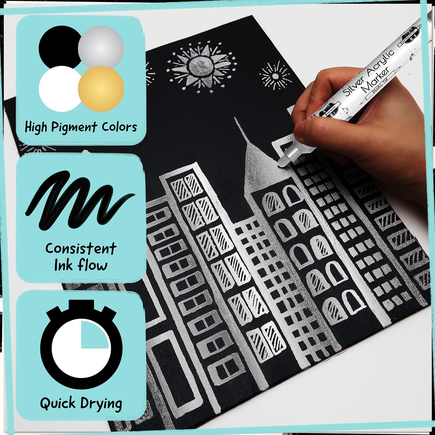 4 Dual Tip Acrylic Paint Pens - Fine Tip & Medium, Permanent & Waterproof - Acrylic Paint Markers for Rock Painting, Canvas, Wood, Ceramic, Glass, Fabric, Metal - White, Black, Gold & Silver