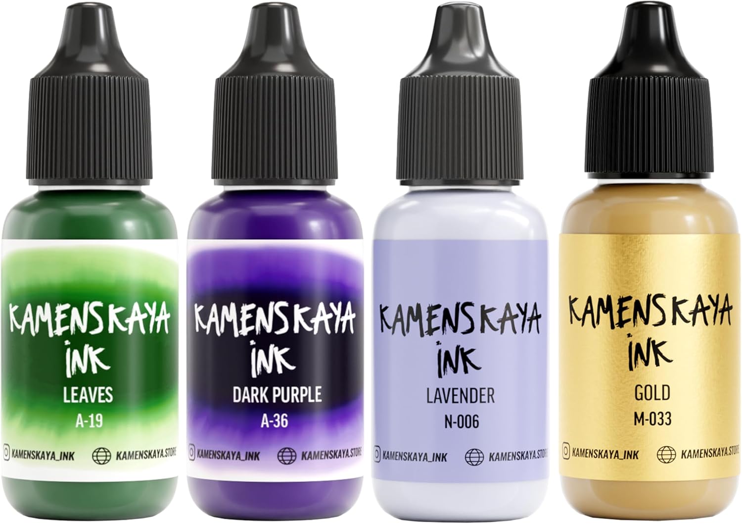 - SET COMPOSITION: 4 inks 0.51 fl oz (15 ml) each. 2 inks of basic βAβ line (light translucent texture, saturated color and a nice satin finish), 1 gold metallic alcohol ink (natural metallic pigment ink to create golden facets and light cobwebs in your ink art work) and 1 pastel alcohol ink (delicate pastel shade with velvety finish based on dye and pigment, where the pigment provides a dense and opaque layer, while the dye is responsible for the color)