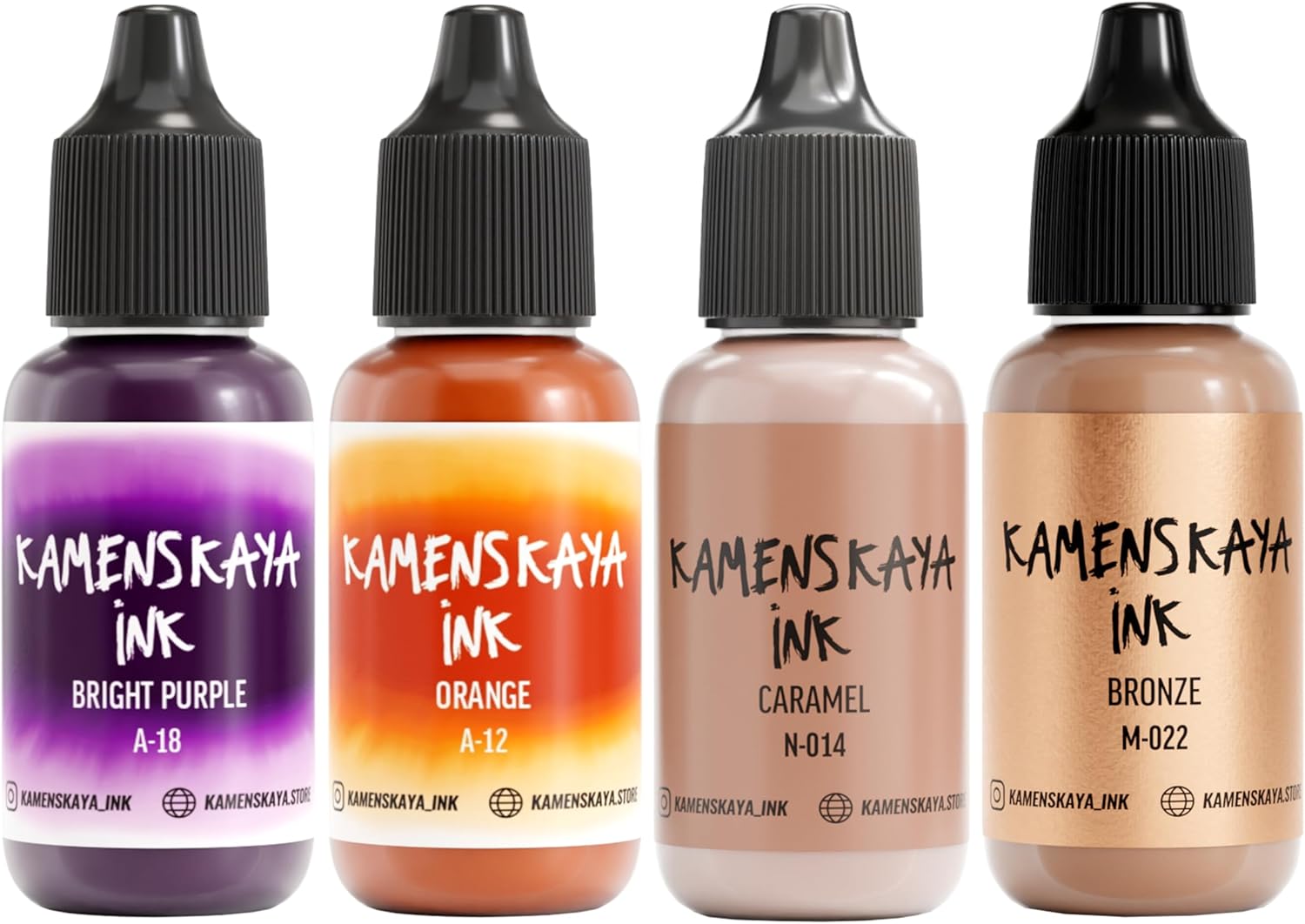 - Set composition: 4 inks 0.51 fl oz (15 ml) each. 2 inks of basic ‘A’ line (light translucent texture, saturated color and a nice satin finish), 1 bronze metallic alcohol ink (natural metallic pigment ink to create golden facets and light cobwebs in your ink art work) and 1 pastel alcohol ink (delicate pastel shade with velvety finish based on dye and pigment, where the pigment provides a dense and opaque layer, while the dye is responsible for the color)