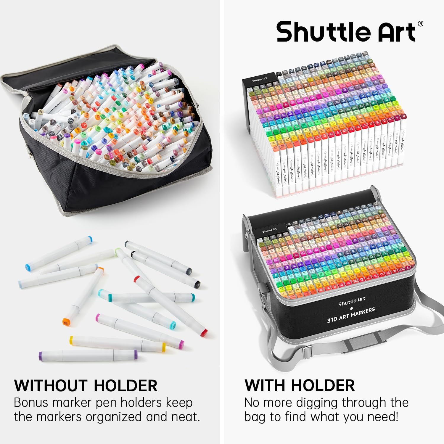 Shuttle Art 310 Colors Alcohol Markers, 309 Colors Dual Tip Art Marker Set Plus Colorless Blender, Micro-tip Pens, White Highlighter Pens, Marker Bag with Holders Perfect for Students Adults Coloring