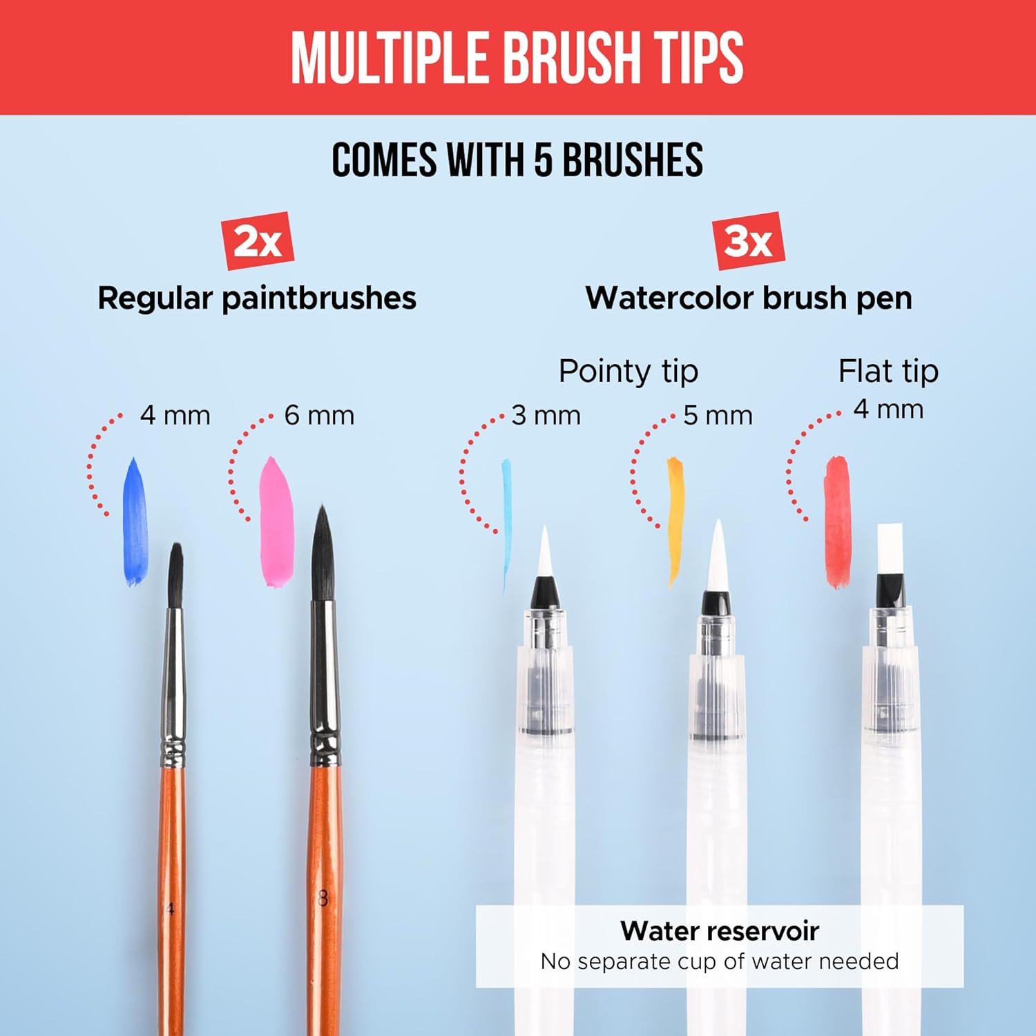 - Everything You Need in One Premium Set: Experience the convenience of having everything you need to create beautiful watercolor paintings in one set. In addition to 100 unique colors, this premium set comes with 3 watercolor brush pens, 2 regular paint brushes, 1 art sponge, and 1 swatch card. Our versatile brushes each feature a different tip, so you can choose what works best for you and your art. Find all your creative essentials in one set for making effortless masterpieces.