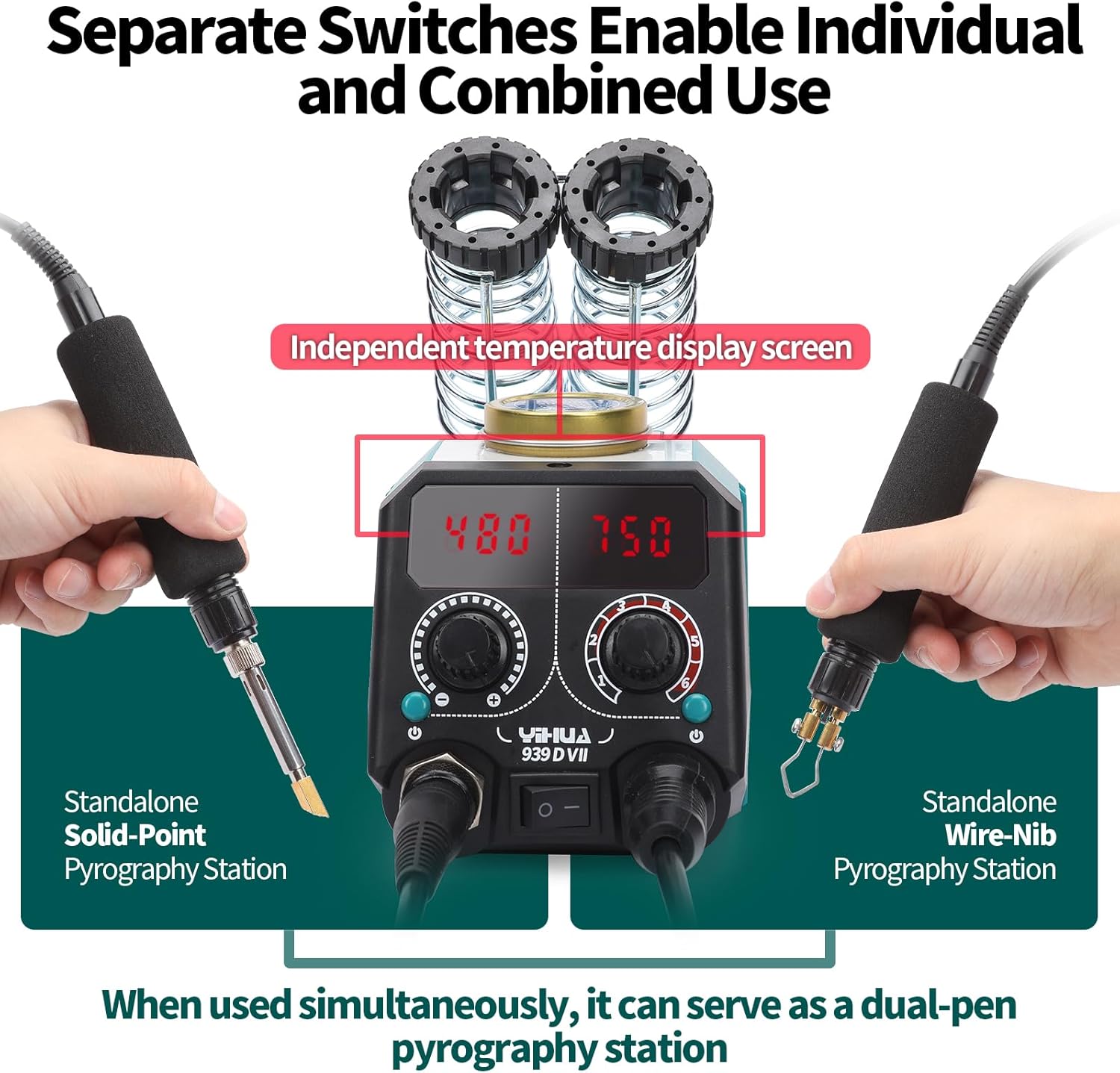 YIHUA 939D-VII Pyrography Tool Wood Burning Pen Kit Station 2-in-1 Solid-Point 200~480°C (with Temp Display)/Wire-Nib 250~750°C with 23 Nibs, 25 Solid Points, 4 Woodpieces