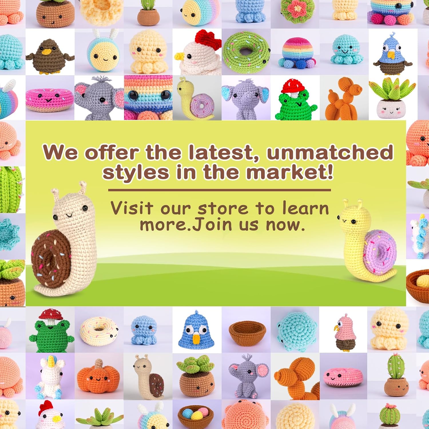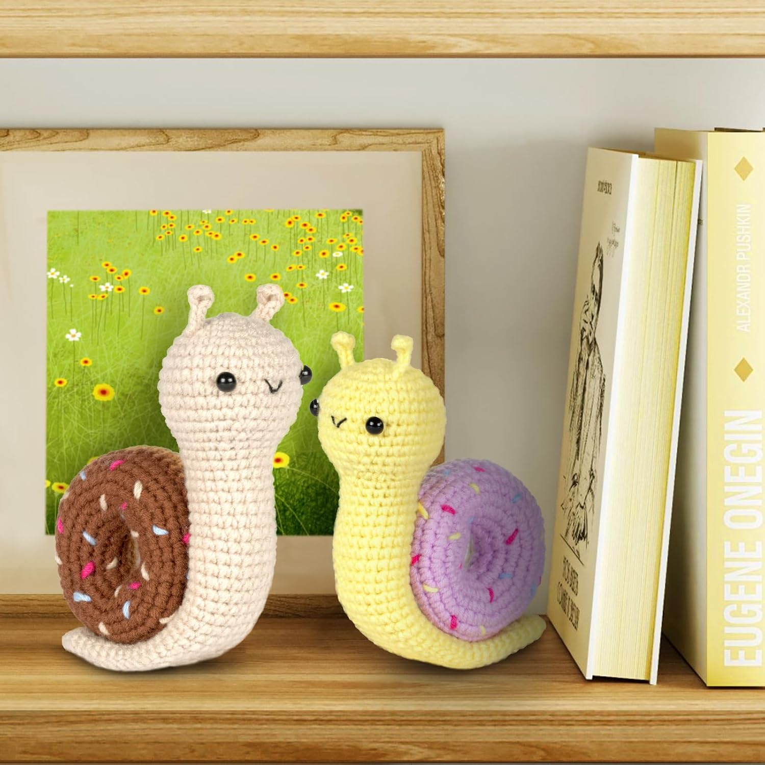 - All-In-One Crochet Kit : Our beginner crochet kit equipped with everything you need to start: 8 different colored yarns, ample stuffing, a needle, 4 safety eyes, 5 marker buckles, 2 crochet hooks, a pair of scissors, a crochet donut snails pattern, and a beginner's basic crochet manual.