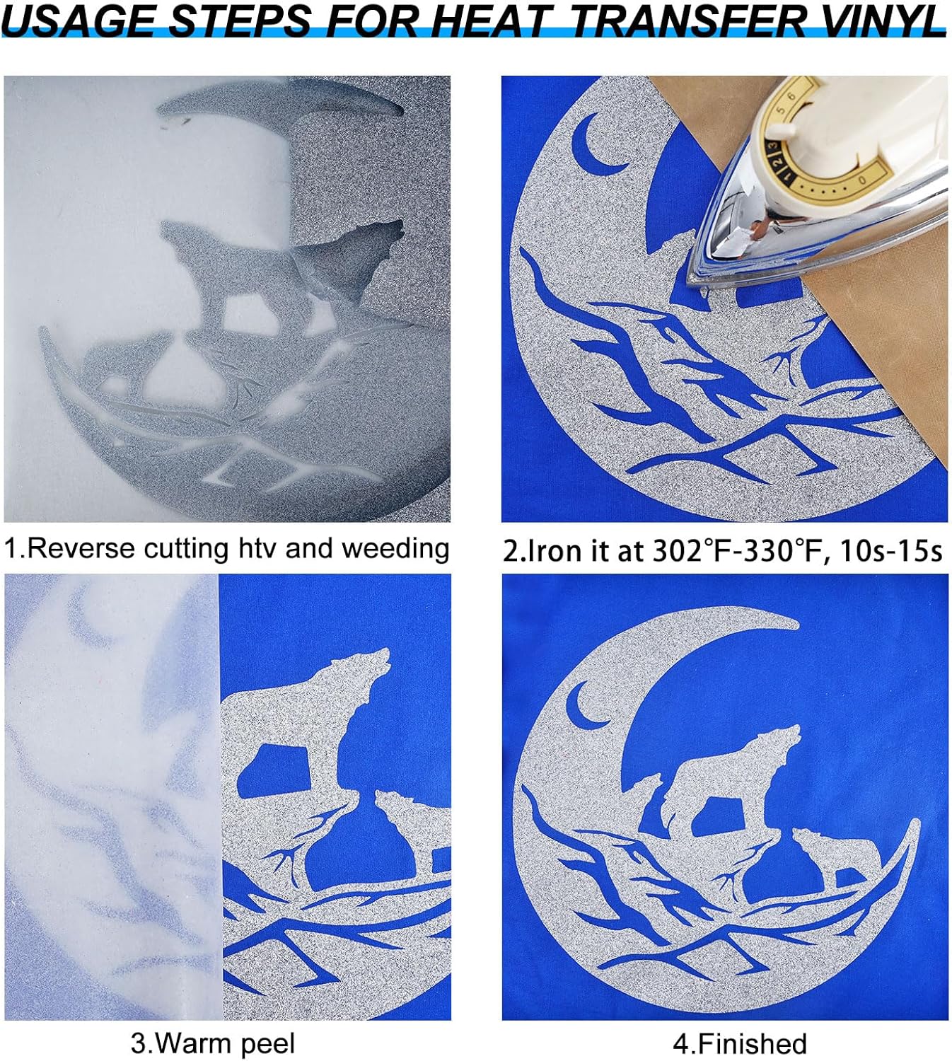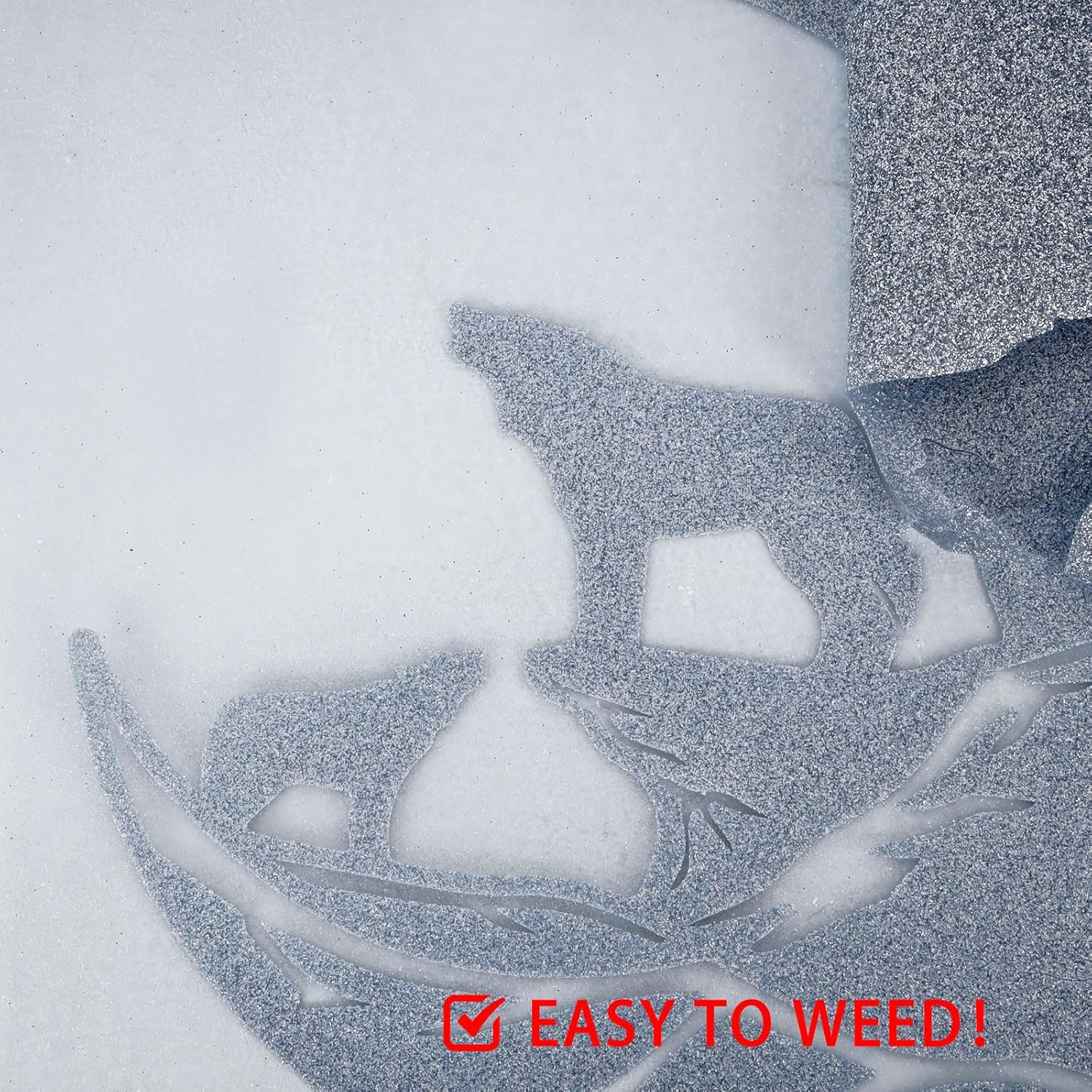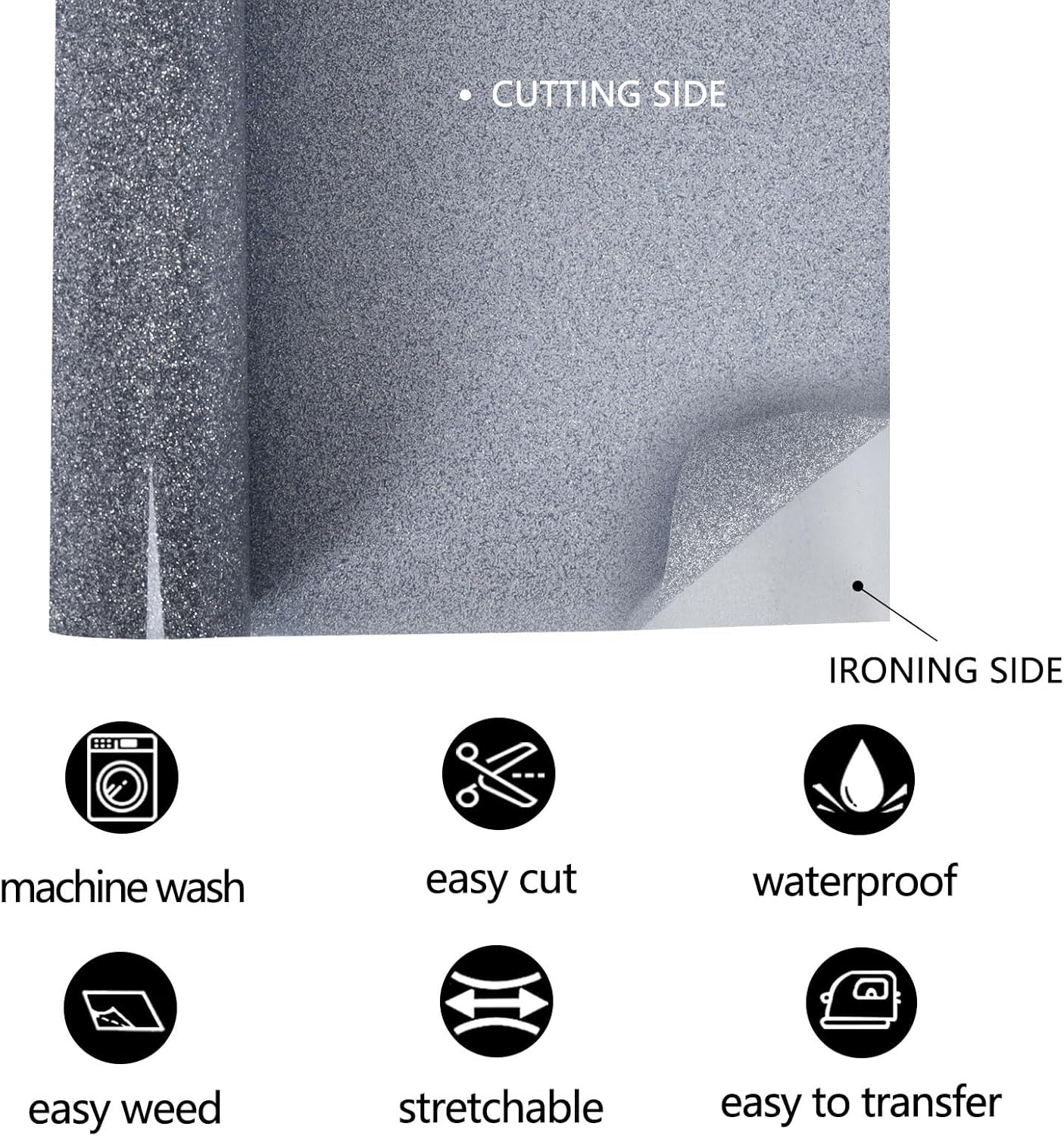 - EASY TO CUT & WEED & TRANSFER: Our silver glitter HTV Vinyl rolls is sensitive to temperature and pressure, which can be quickly and easily to weed and peel. It is compatible with all cutter machines, most heat presses and household irons on the market, and perfect for 12x12" and 12x24" cutting mats. You can easily apply adhesive backing HTV to fabric using a hot iron or hot press. Please note that it is warm peel