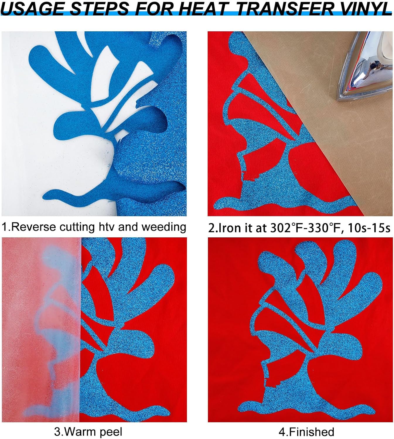 - EASY TO CUT & WEED & TRANSFER: Our blue glitter HTV Vinyl rolls is sensitive to temperature and pressure, which can be quickly and easily to weed and peel. It is compatible with all cutter machines, most heat presses and household irons on the market, and perfect for 12x12" and 12x24" cutting mats. You can easily apply adhesive backing HTV to fabric using a hot iron or hot press. Please note that it is warm peel