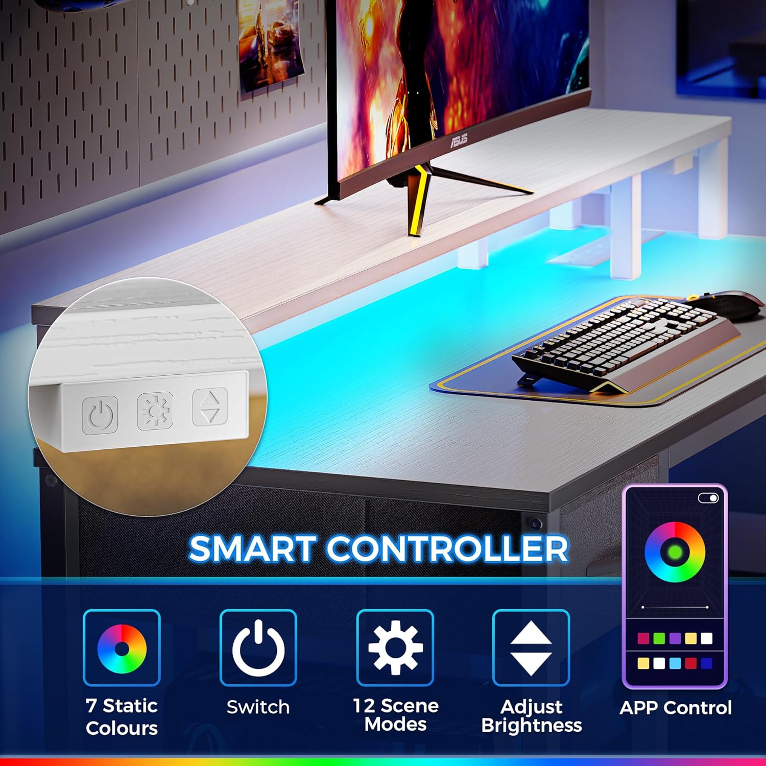 - ăL Desk with LED LightsăPATENT PENDING! Create the perfect ambiance for gaming or working with this computer desk. Choose from over 60,000 colors and enjoy the timing mode, mic mode, and music mode via the App. Alternatively, use the smart controller to switch between 12 scene modes, adjust speed levels, and set 3 brightness levels. Plus: The LED light strip needs to be plugged into a USB port to work
