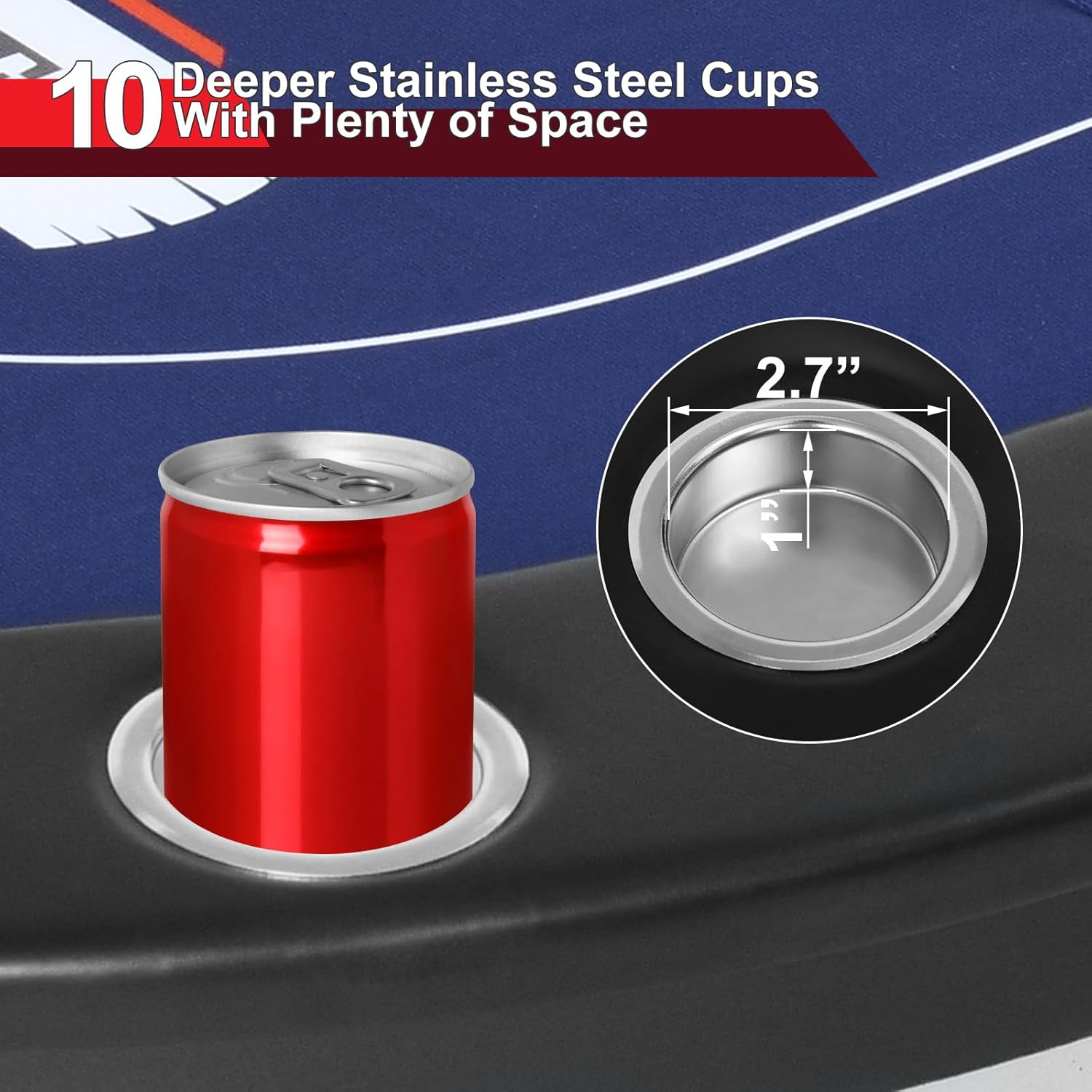 - Portable Cup Holder: Our folding Texas holdem table is designed with 10 cup holders on the top edge of the table, that securely hold water cups or beer bottles. This prevents accidental spills while playing Texas Hold'em. ensuring that we enjoy coolness when playing exciting poker games.
