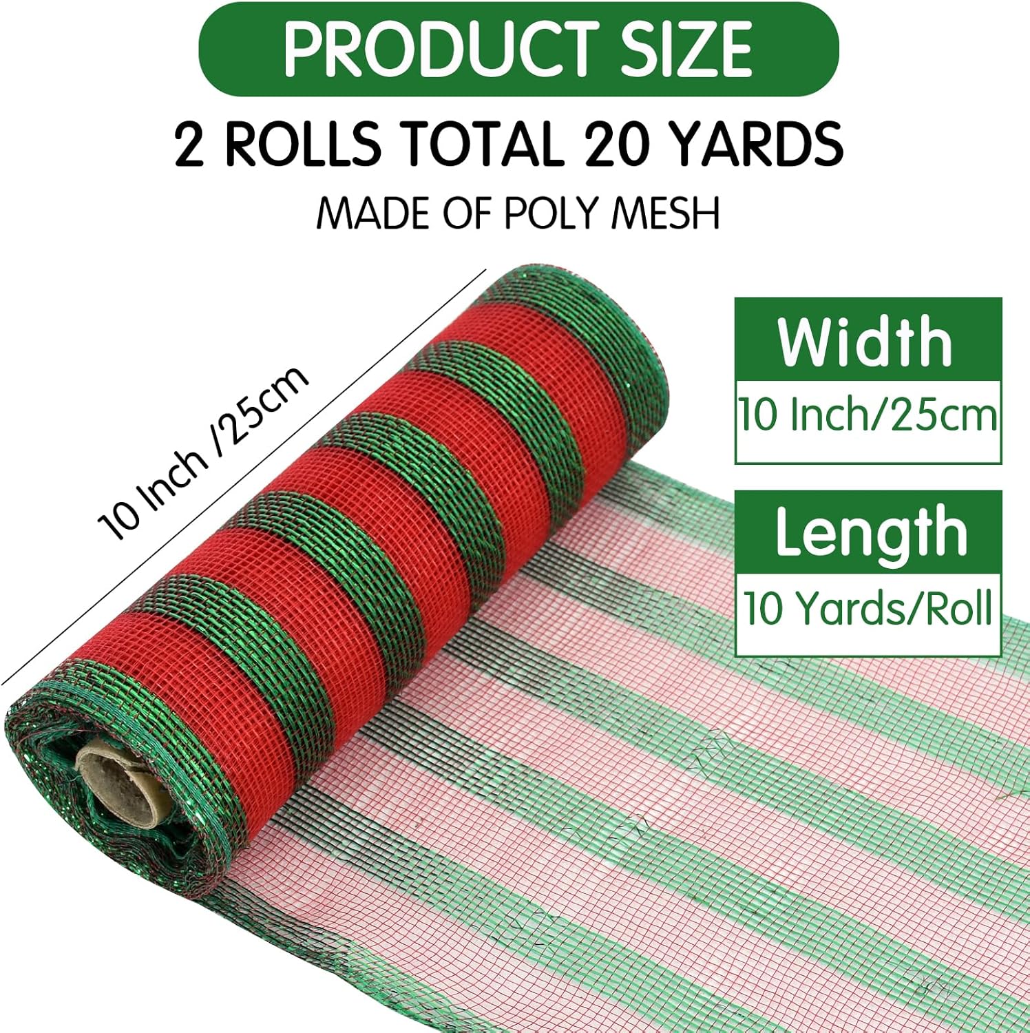 TONIFUL 2 Roll 10 Inch Red and Green Striped Decorative Mesh Ribbon Rolls for Indoor Decor Christmas Valentine's Halloween Party Accessories Party Decoration Supplies (10yds/roll)