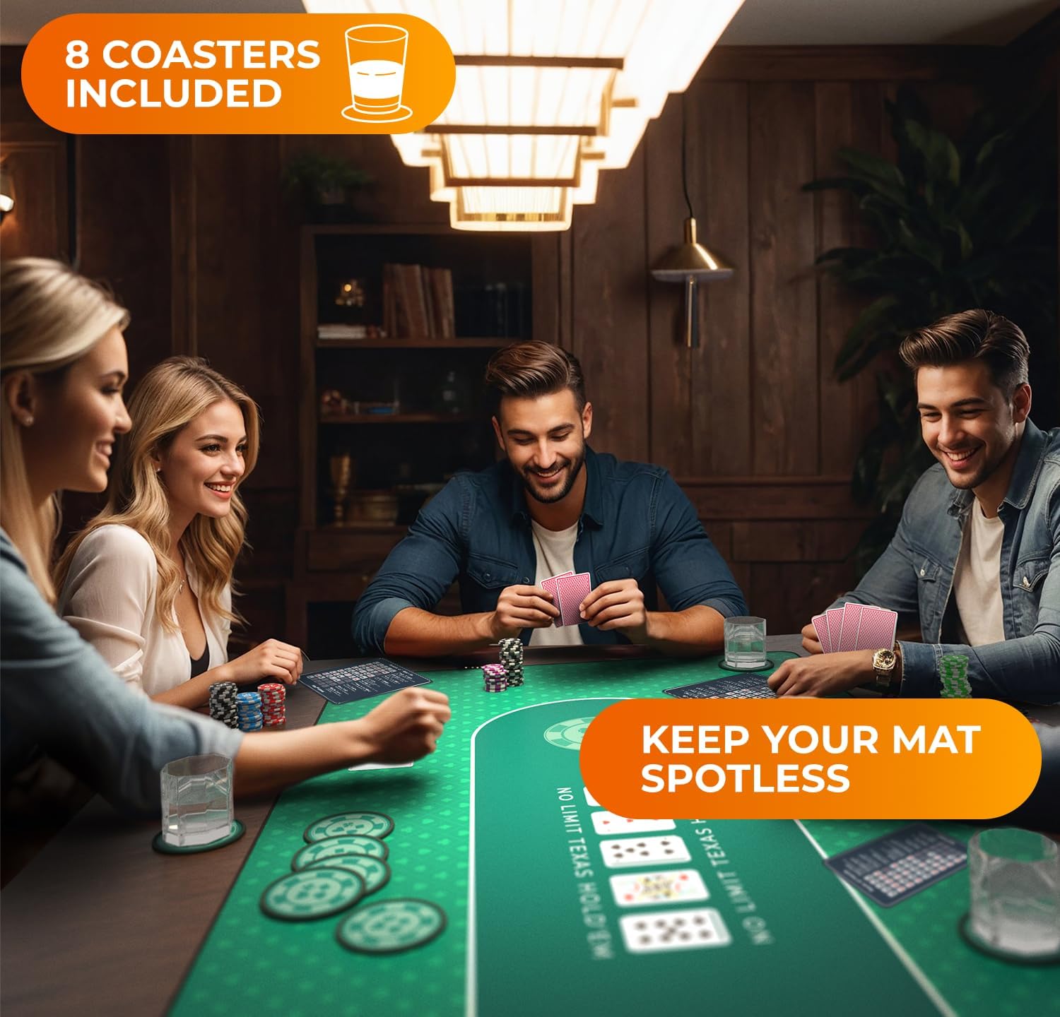 - Coasters & quick-reference cards - Say goodbye to drink stains with our 8 coasters, designed to protect your poker mat for table from dirty circles caused by glasses. Use the included 8 insert cards to display poker hands, offering quick reference for a phone-free, focused game.