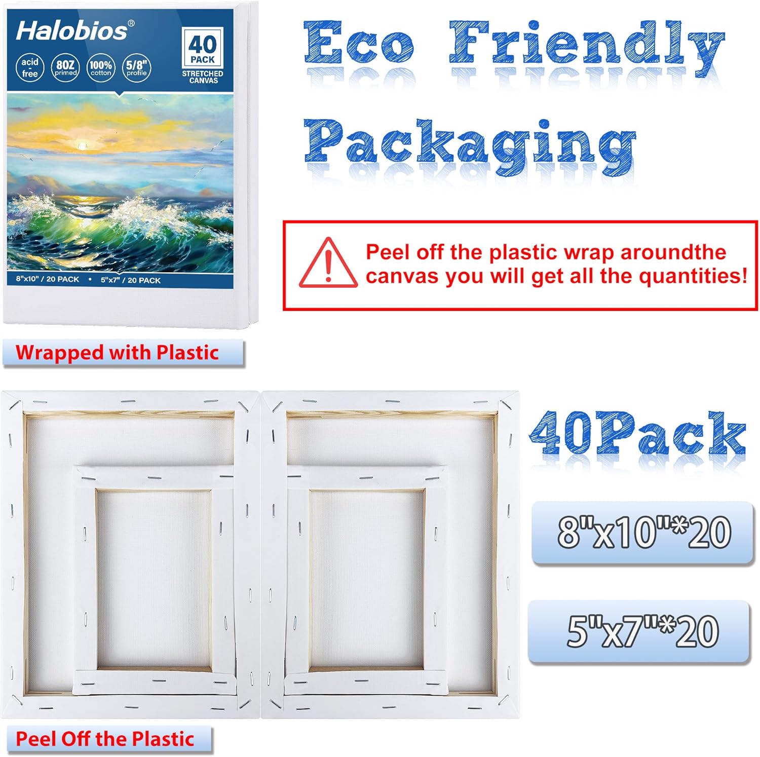 Blank Canvas for Painting, Bulk Pack of 40-8x10 inches, 5x7inch(20 of Each), 100% Cotton, Primed, 5/8 Inch Profile of Super Value Canvas Pack for Acrylics, Oils & Other Painting Media