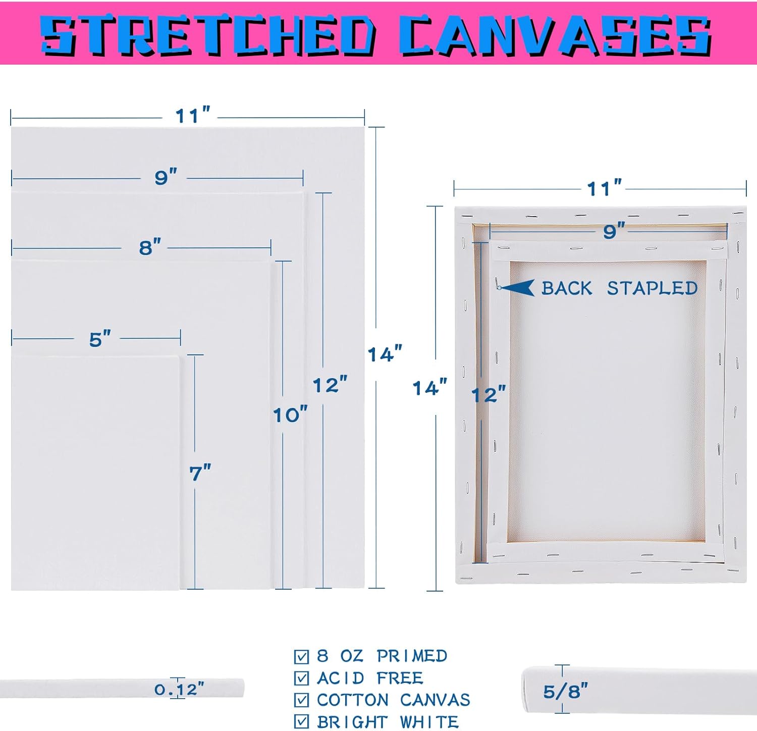 - 【Value Pack】This 68-Pack pre-stretched Blank Canvases & Boards for SET includes 2 different sizes of Canvases and 4 different sizes of Boards to choose from, for Drawing, Painting, and Art Supplies. Canvases Size: 2 Pcs for 9×12 inches and 8 Pcs for 11×14 inches. Boards Size: 20 Pcs for 5×7 inches, 20 Pcs for 8×10 inches, 10 Pcs for 9×12 inches, and 8 Pcs for 11×14 inches.