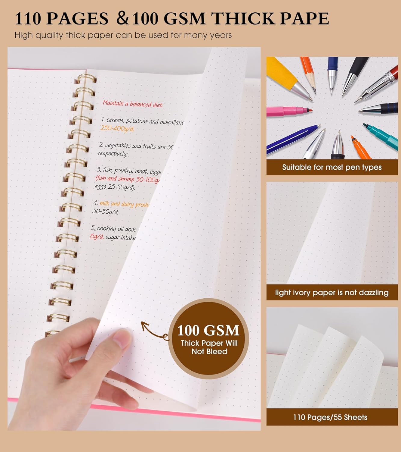 - 【100 GSM Ink-friendly Paper】 Our pink spiral dot grid notebook pages are very thick, which avoids ink bleeding through and ghosting. Suitable for most pen types, such as ballpoint pens, fountain pens. Each dotted journal 55 sheets/110 pages, offering enough space to write in. Allowing you to write on both sides of every page to maximize your usable space. light ivory paper is not dazzling, let you have a comfortable writing experience.
