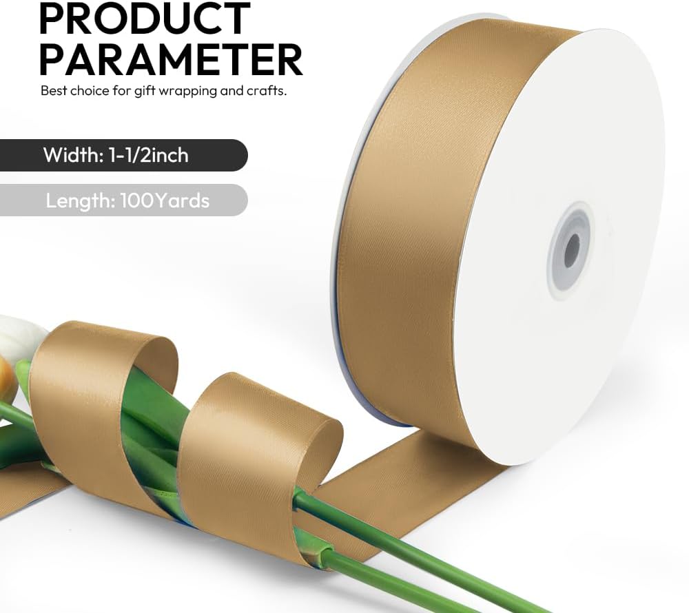 1-1/2 Inch 100 Yards Satin Ribbon Champagne Gold, Solid Color Fabric Ribbon for Gift Wrapping, Wedding, Polyester Gift Ribbon for Birthday Party Decoration, Craft, Hair, Floral, Sewing