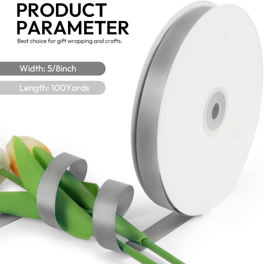 - 【High Quality】: Our fabric satin ribbon is made of 100% high-quality polyester. The single face ribbon for gift wrapping is Silver(Grey) color and has smooth texture which is easy to cut and use.