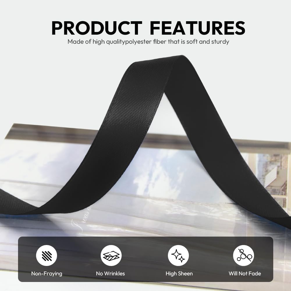 - 【High Quality】: Our fabric satin ribbon is made of 100% high-quality polyester. The single face ribbon for gift wrapping is Black color and has smooth texture which is easy to cut and use.