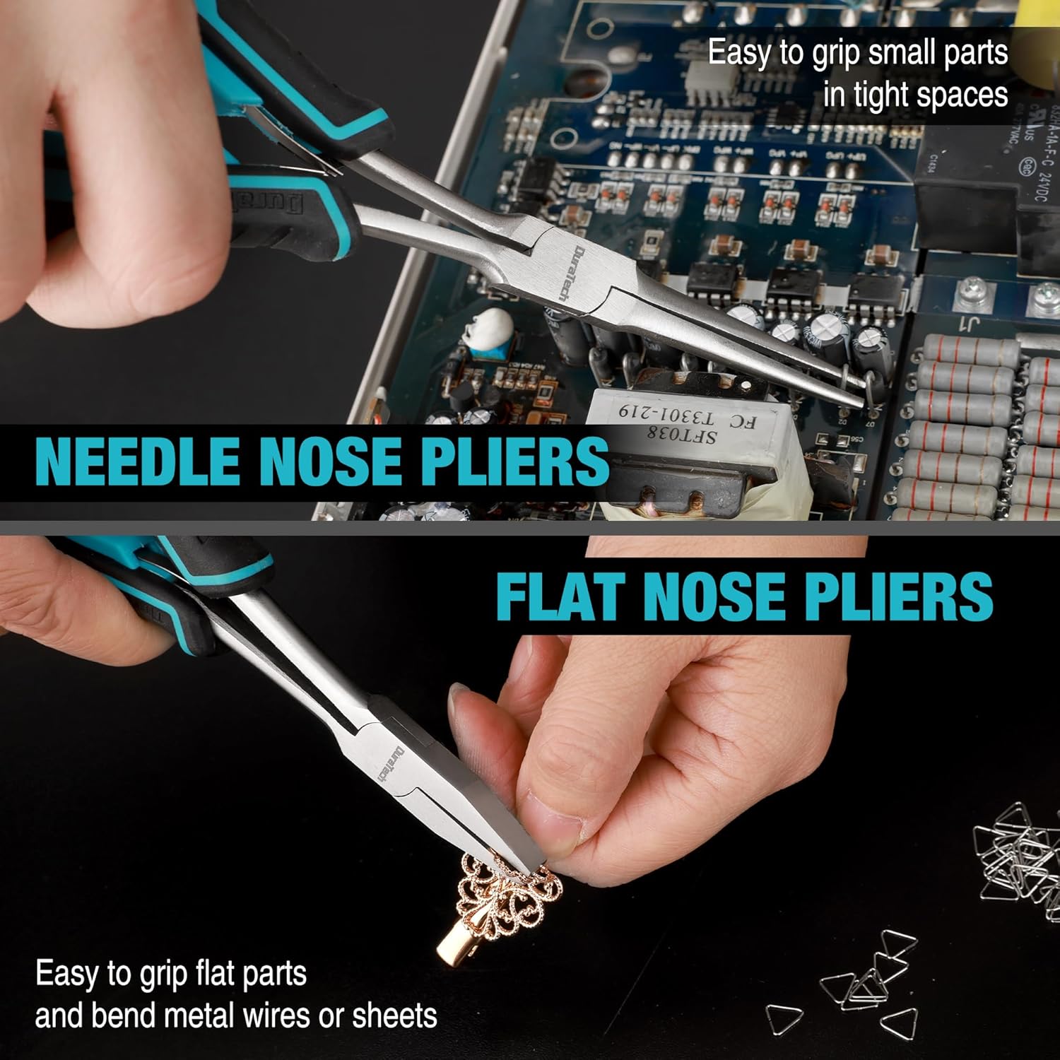 DURATECH 4PCS Long Reach Pliers Set with Pouch - Needle Nose, Diagonal, Linesman and Flat Nose, Mini Extra Long Pliers Set for Jewelry Making, Wire Bending and Object Gripping on Narrow Space