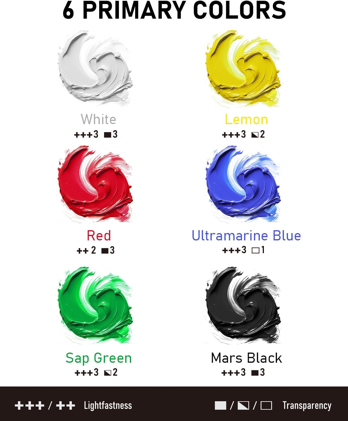 - 6 Primary Colors - This large acrylic paint includes 6 basic colors (white, mars black, red, lemon, sap green, ultramarine blue). The 69oz large bottle comes with pump for easy using or dispensing paint. We also provide a palette knife and a sponge for you to create different effects on paintings, and a color wheel to help combine color