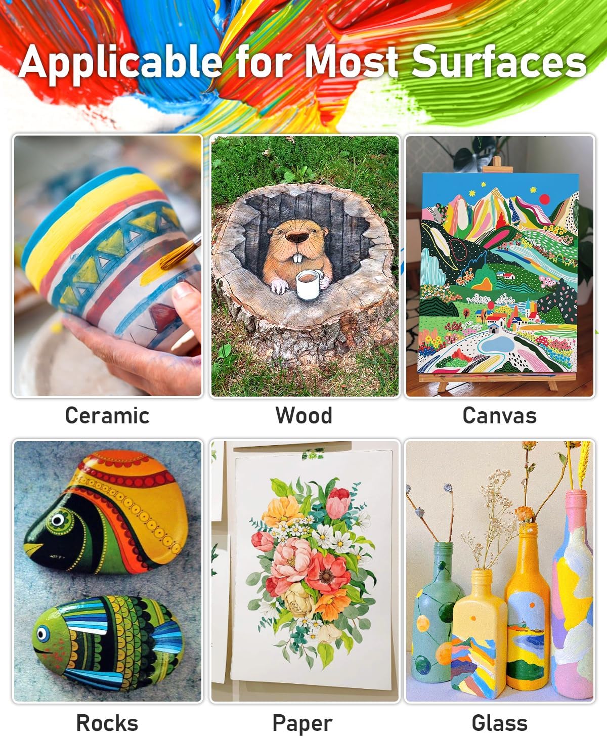 - Wide Application In School and Art Class - This versatile acrylic paint can be applied to most surfaces like ceramic, wood, rocks, canvas, fabric, glass, paper, chalk board, etc. Great for large art projects, wall painting, paint party, school teaching, art class and more