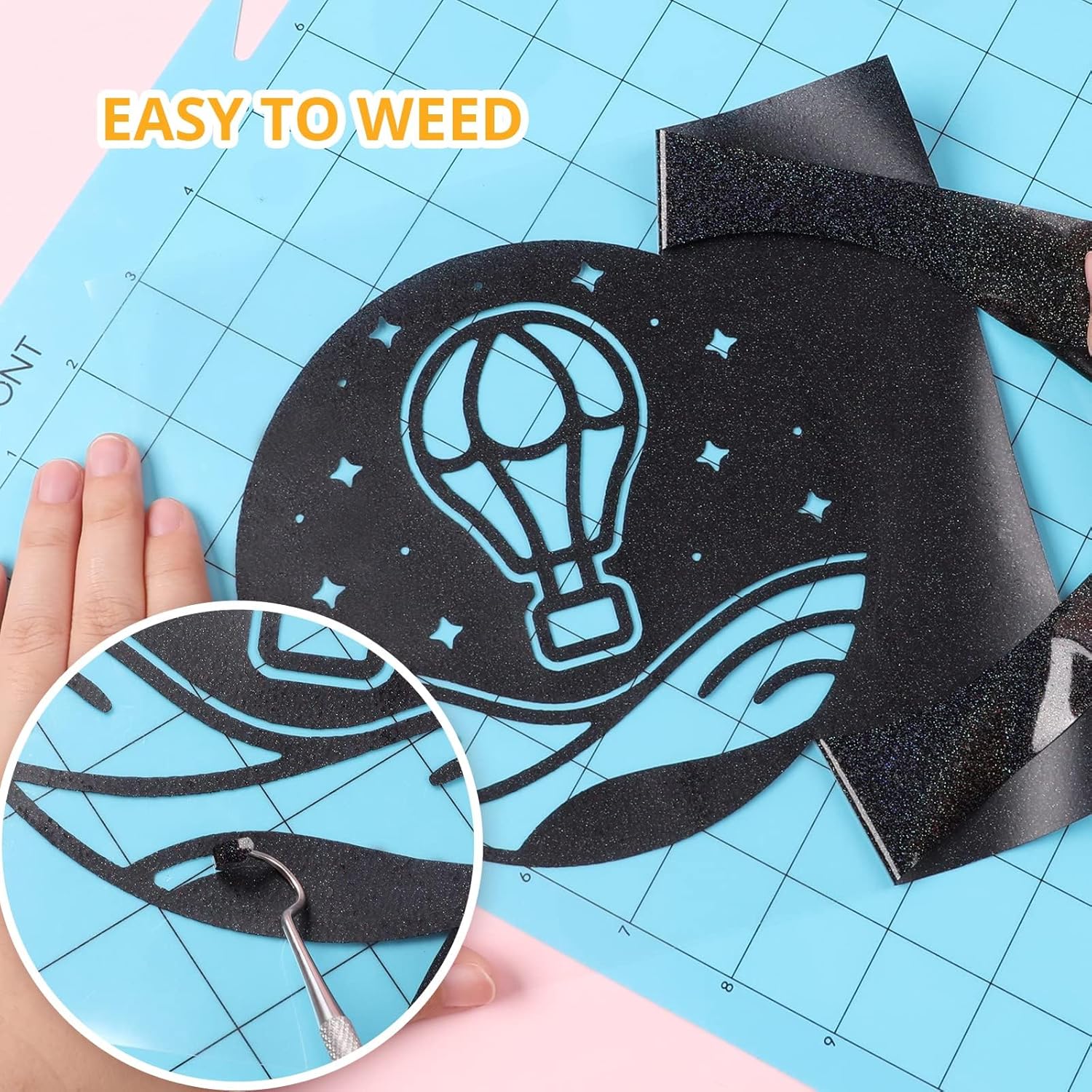 - 【Easy to Cut & Weed & Transfer】Our HTVRONT glitter htv is thicker and smooth. With its good cutting application characteristics, you can get your designs to perfection without wasting excess glitter heat transfer vinyl. At the same time, our glitter iron on vinyl is very sensitive to temperature and pressure, just follow the instructions and you can easily transfer the vinyl to the fabric.