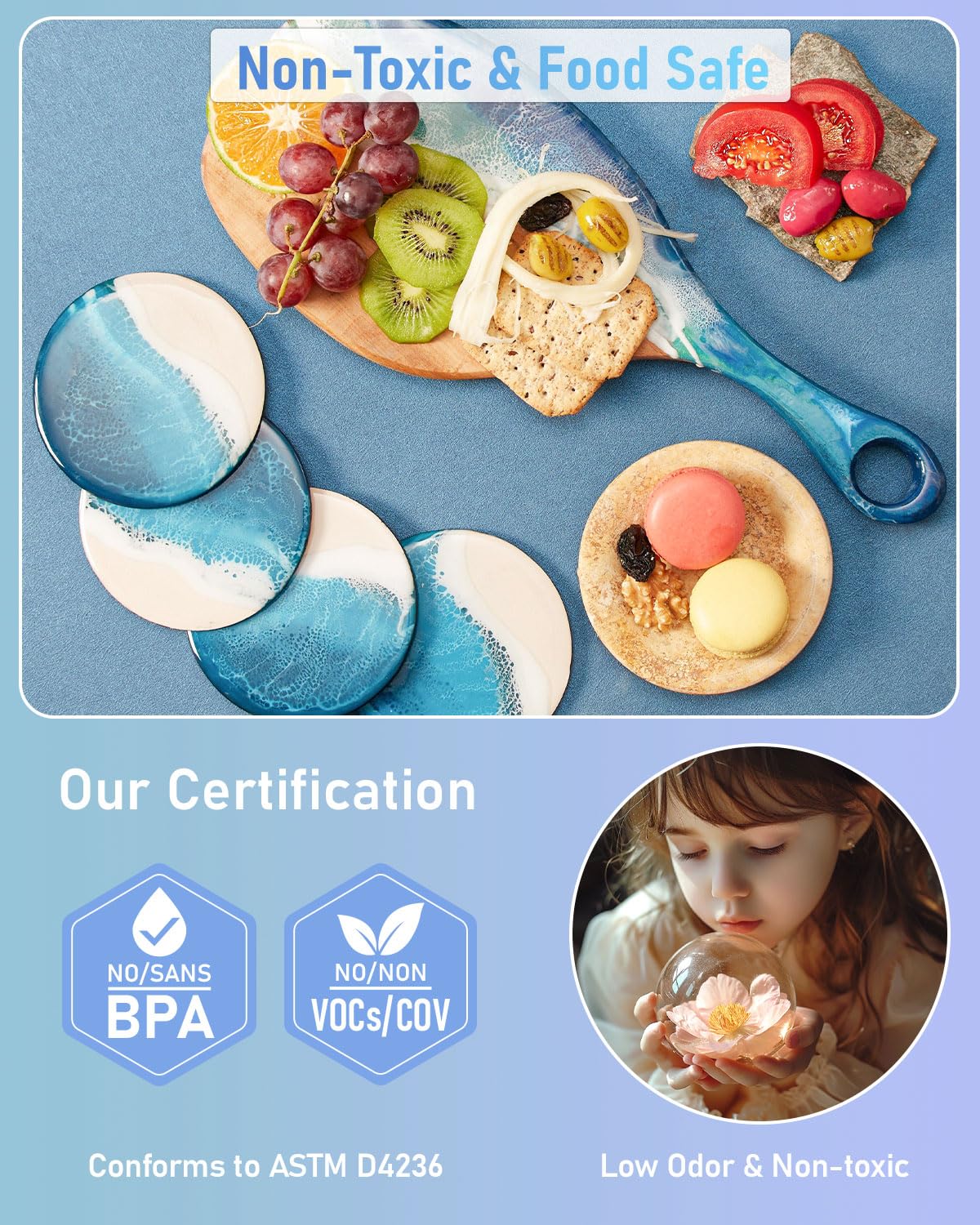 - Non-Toxic & Food Safe – Safe for All Creators. Made from premium, low-odor materials, this epoxy resin kit is certified non-toxic and conforms to ASTM D-4236 standards. Once cured, it’s safe for food contact—ideal for making coasters, serving trays, and kitchenware. No VOC emission, no fumes—safe for both personal and classroom use
