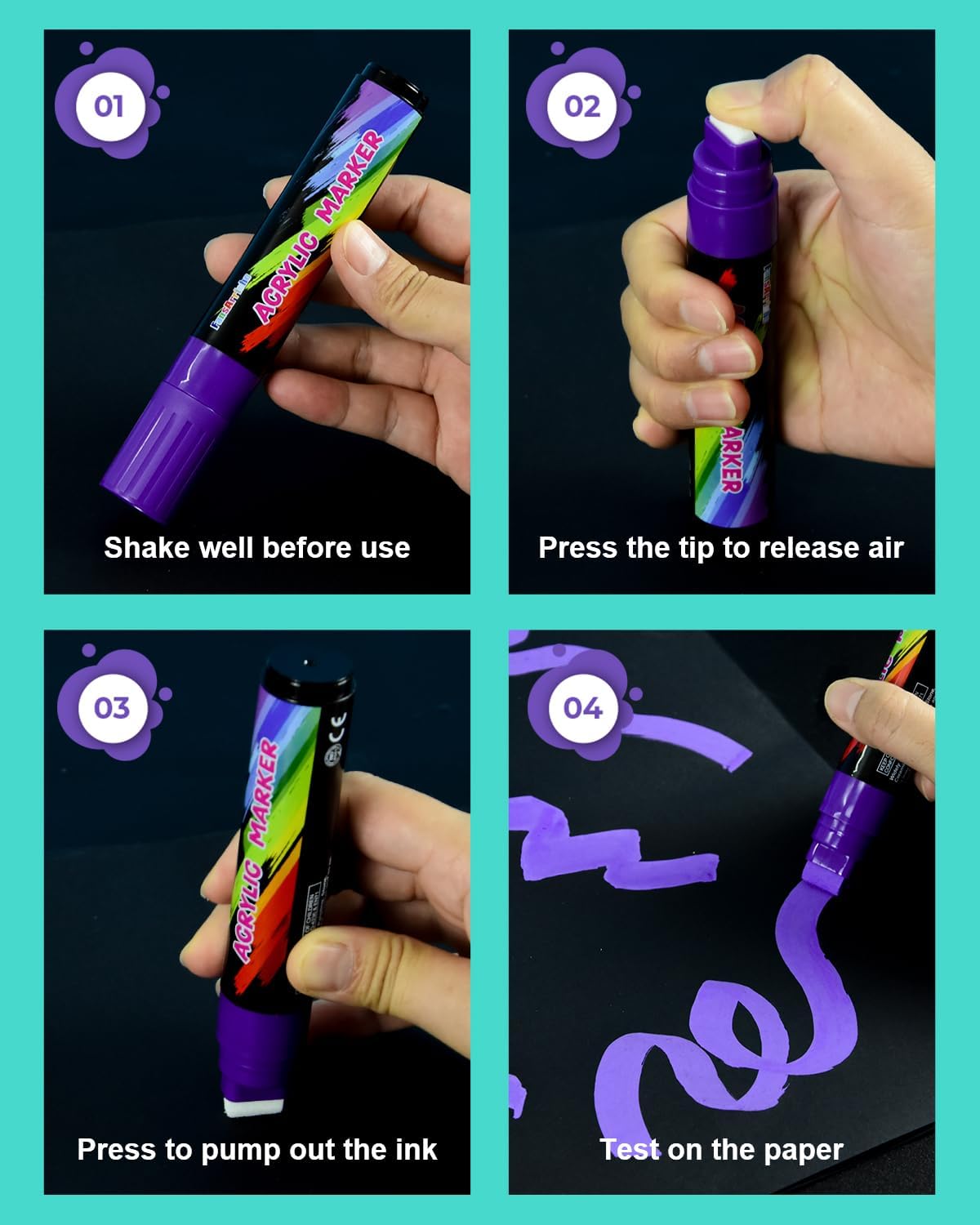 - Vivid Colors Acrylic Paint Markers: Our 15mm jumbo permanent paint markers come with exceptionally vivid colors that stand out on any surface. They are filled with high-quality water-based permanent acrylic paint ink, ensuring smooth application and excellent coverage.
