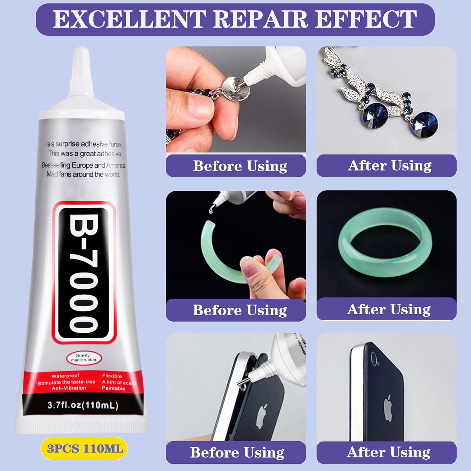 - 【Upgraded 110ML B7000 Glue】B-7000 rhinestone clear glue can isolate gas, liquid and air flow, which is transparent, waterproof and highly elastic. This transparent glue will not leave stains after use. That makes it great for restoring phones and jewelry. It has such a restorative effect that no one will know that your item has been restored. You can also use it to make all kinds of handicrafts.