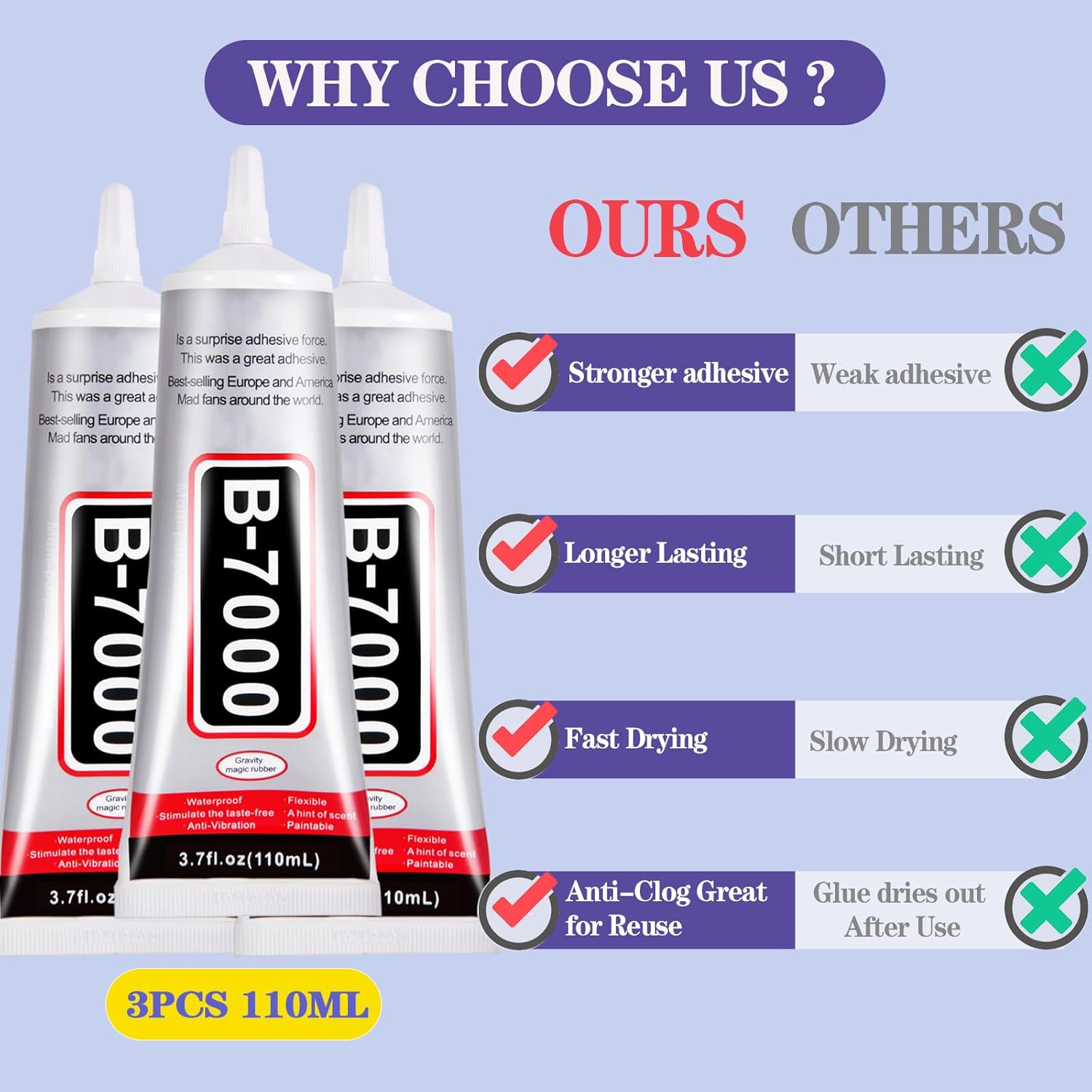 - 【3 Pack 110ml/3.7oz Large Capaity Glue】This glue set includes 3 pcs of 110ml B7000 glue. Each bottle of B7000 adhesive boasts a generous 110ml capacity, providing you with plenty of glue for multiple uses to tackle various projects. Three bottles ensures that you have enough spare glue to meet your daily needs for various crafts.