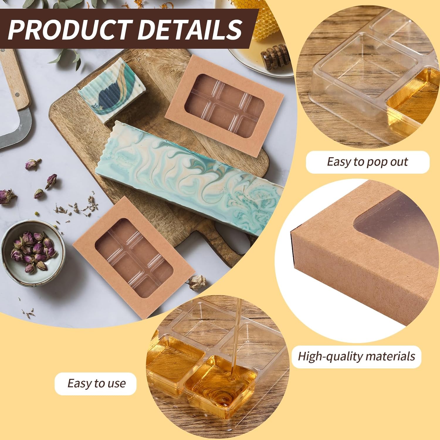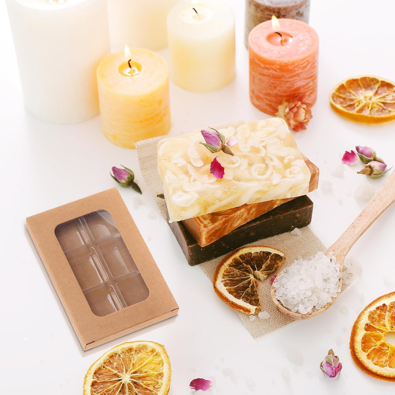 - 5. Wide application: This wax melt boxes can not only meet your daily DIY needs at home, but can also make exquisite wax melt gifts for family and friends. Wax Melt Molds are also great for small candle companies, you can use them to create beautiful wax melt samples to give away to customers, and the kraft paper packaging will give your products the look and feel of a high-priced product!