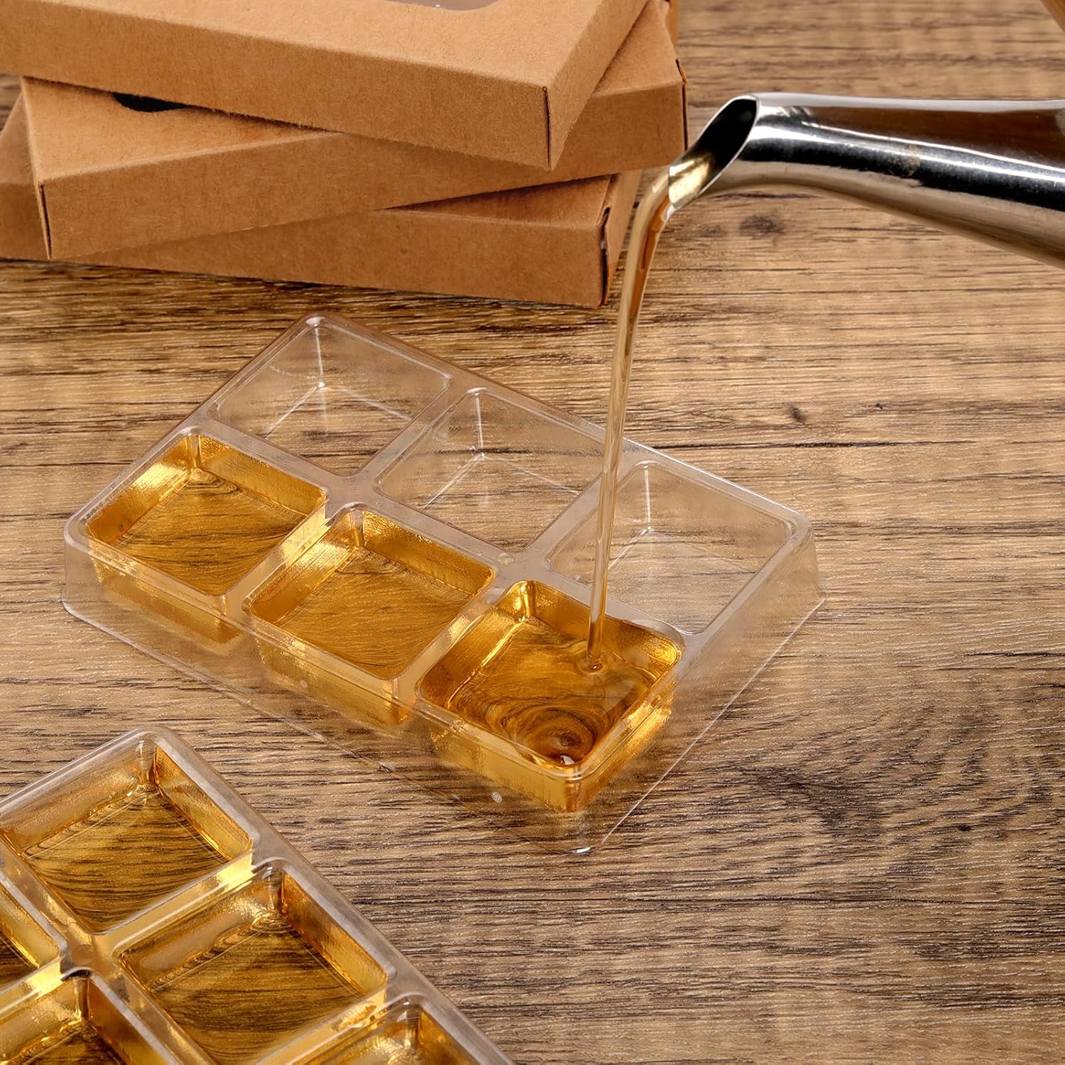 - 1. NOTE Please pouring wax into 6 cavity wax melt plastic molds below 149°F. What You Get: You will receive 50/100 Wax Melts molds with Kraft Box. Each Crystal Clear mold comes with a kraft paper packaging box. 6 Cavity Plastic Mold with box measures 4" x 2.8" x 0.59" and the inner tray cavity unit measures 1.1" x 1.1" x 0.5". The size of the kraft paper box is 4.4*3*0.7 inches.Pair it with a kraft paper box to give your carefully crafted wax block a sophisticated look.
