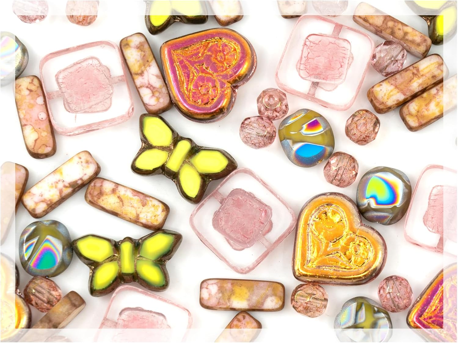 - ⭕️ COLOR ► Pale pink and pale green bead mix with opaque and transparent beads ⭕️ BEADS ► only FOCAL bead mix with squares, rectangles, butterflies, hearts, and table-cut beads